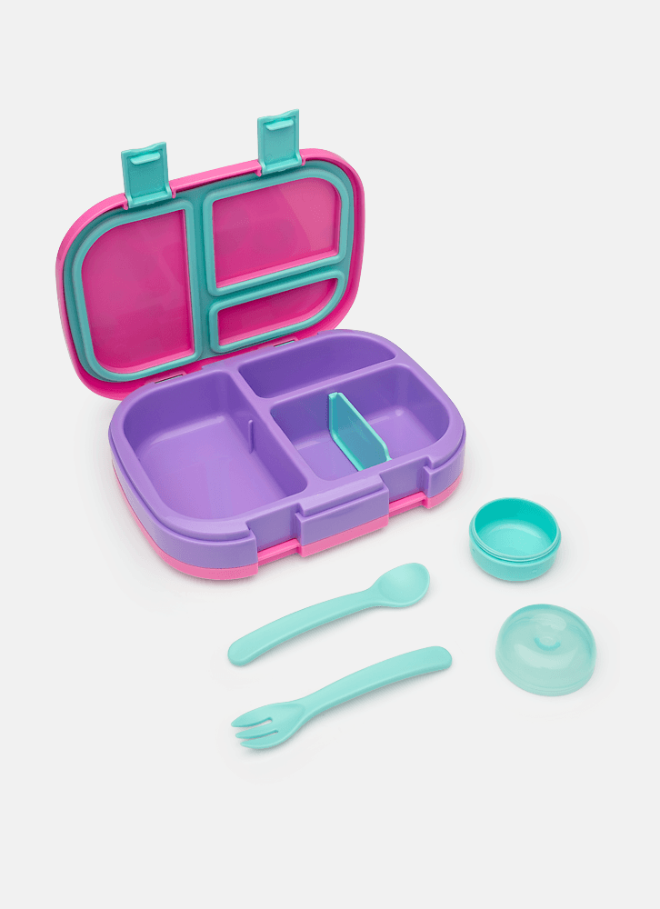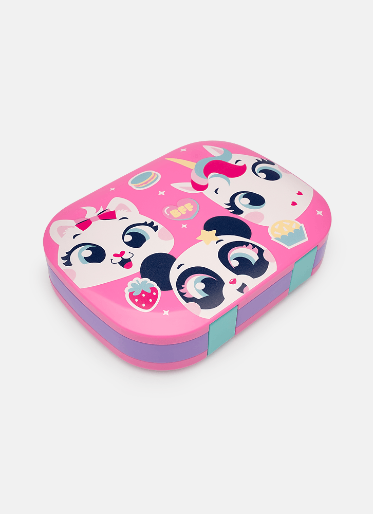 Marmita Grande em formato retangular de borda arredondada, tampa de encaixe com estampa de Multibichos. Acompanha 1 garfo e 1 colher de plástico.