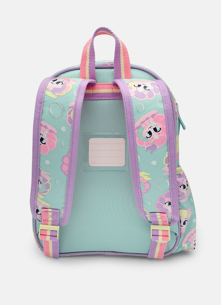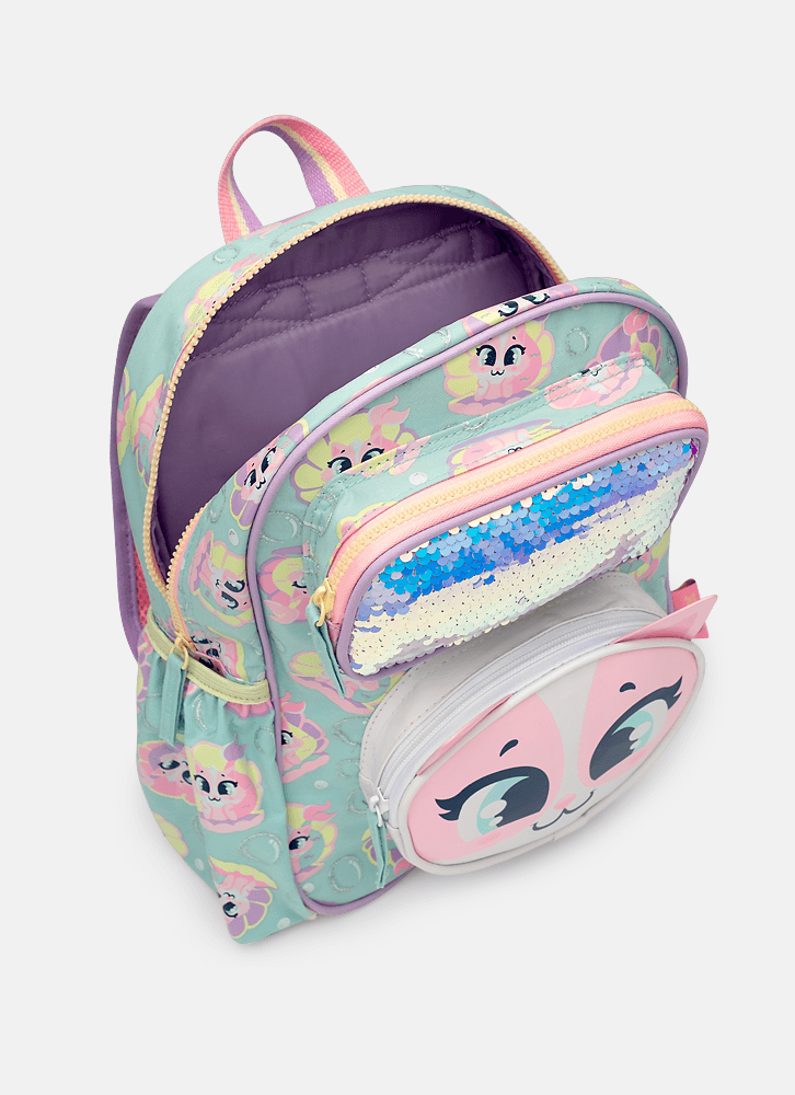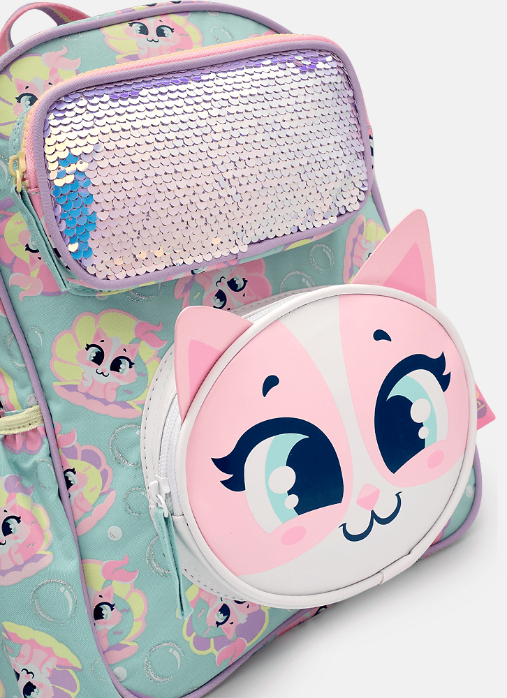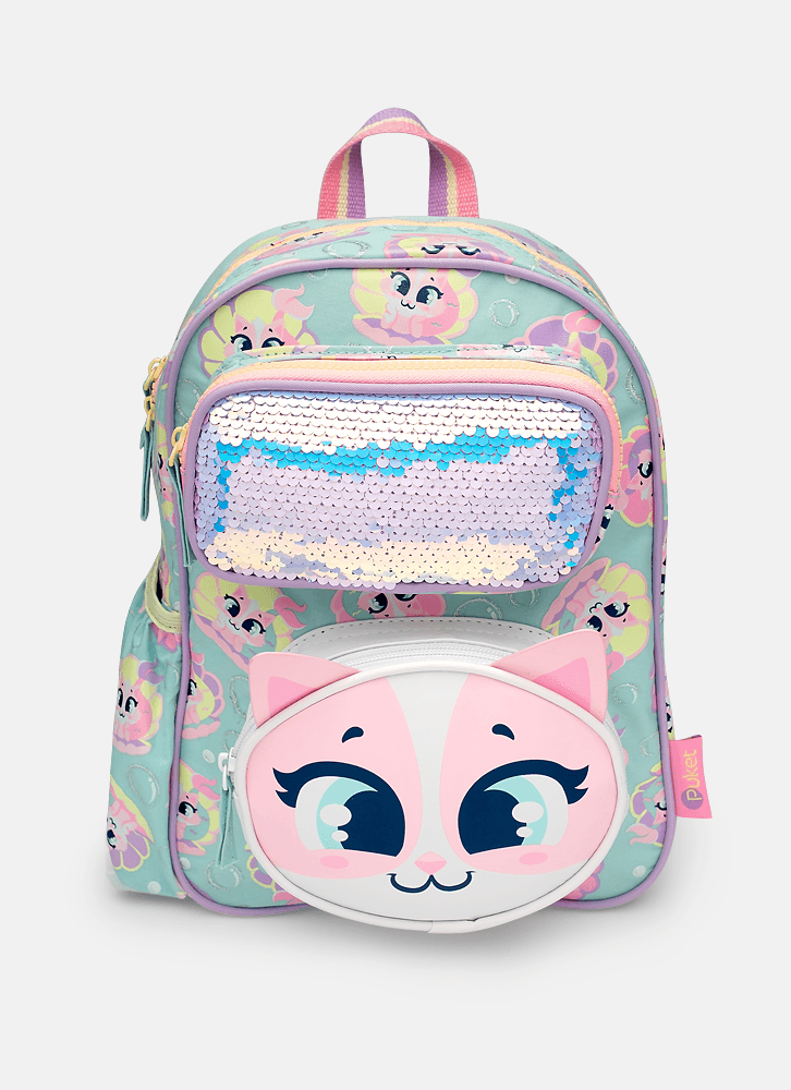 Mochila pequena em nylon com estampa corrida de gata, bolso frontal com formato de gata em PU fosco com aplique de orelinhas, bolso frontal pequeno com paetê reversível. Possui bolsinho lateral para garrafinha.