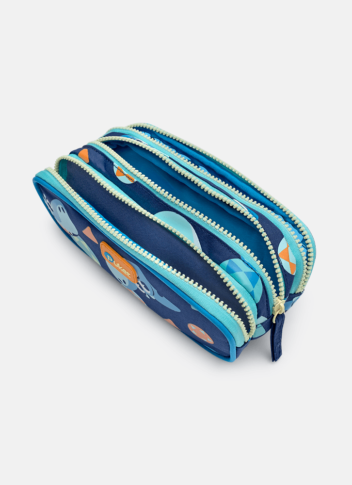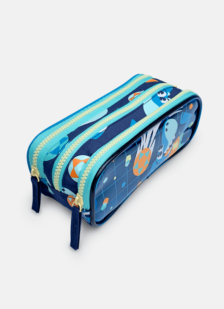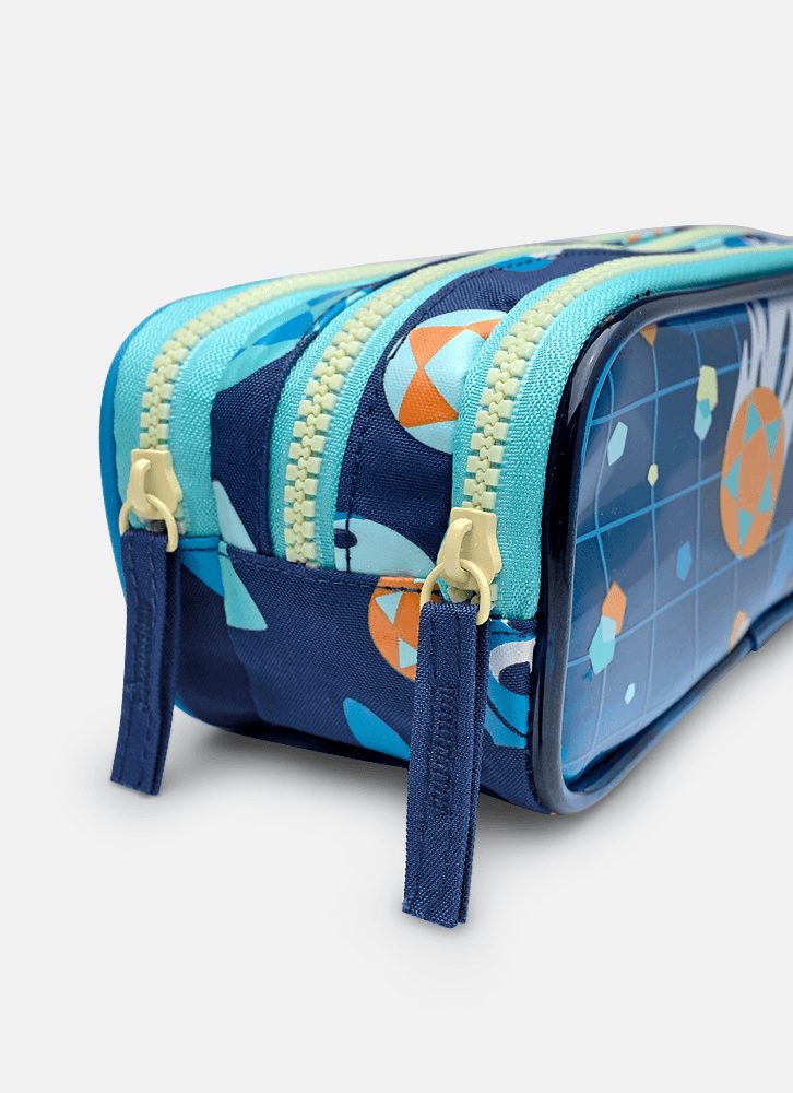 Estojo tripo, parte frontal em PVC telado com estampa de tubarão.