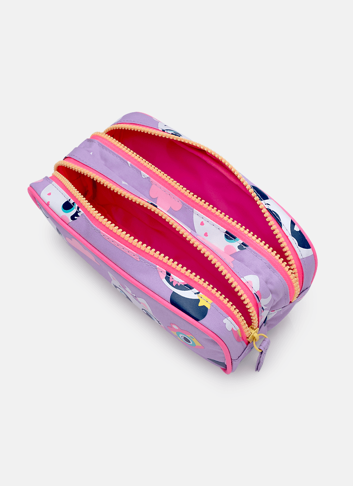 O estojo duplo possui 2 compartimentos, o que é ótimo para o armazenamento dos seus itens. Com estampa corrida de multibichos.