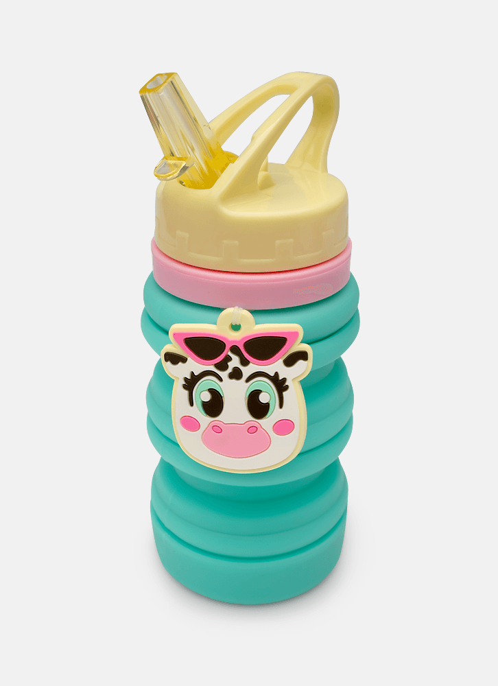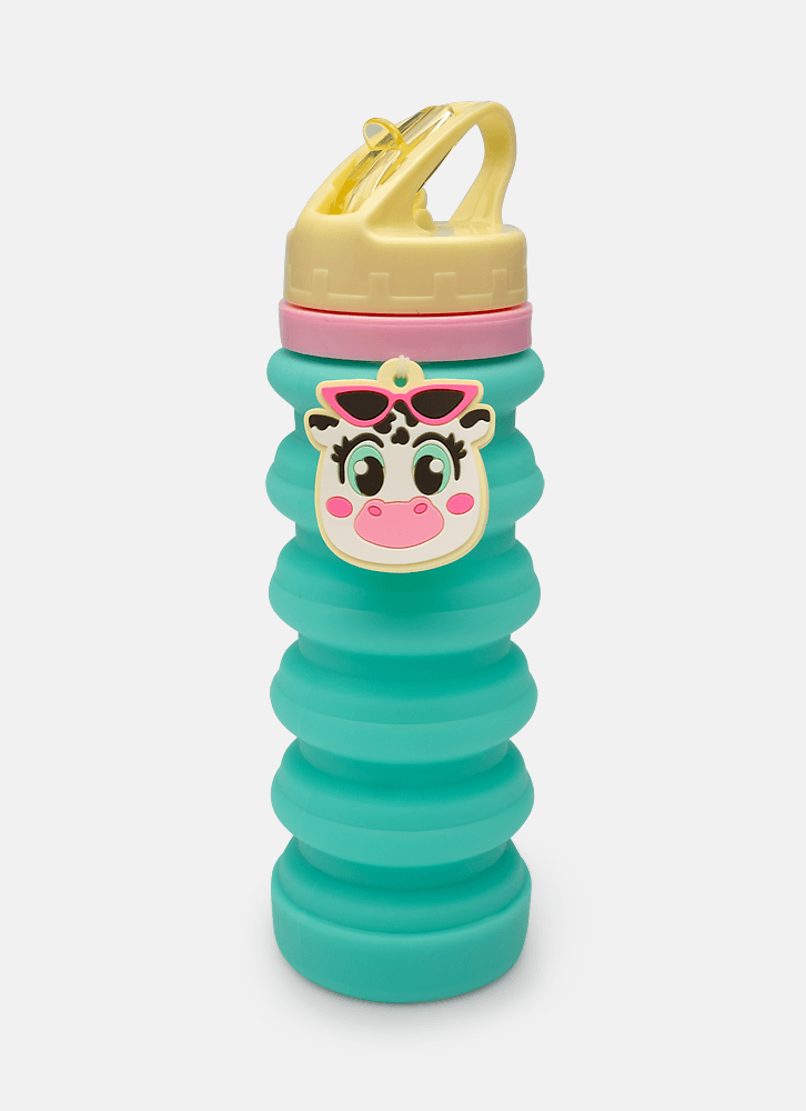 Garrafinha em silicone. Possui forma retrátil (menor quando vazia), tampa de rosquear com bico embutido e aplique emborrachado de Vaca.