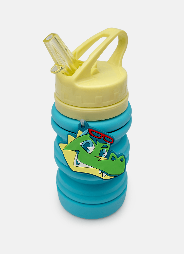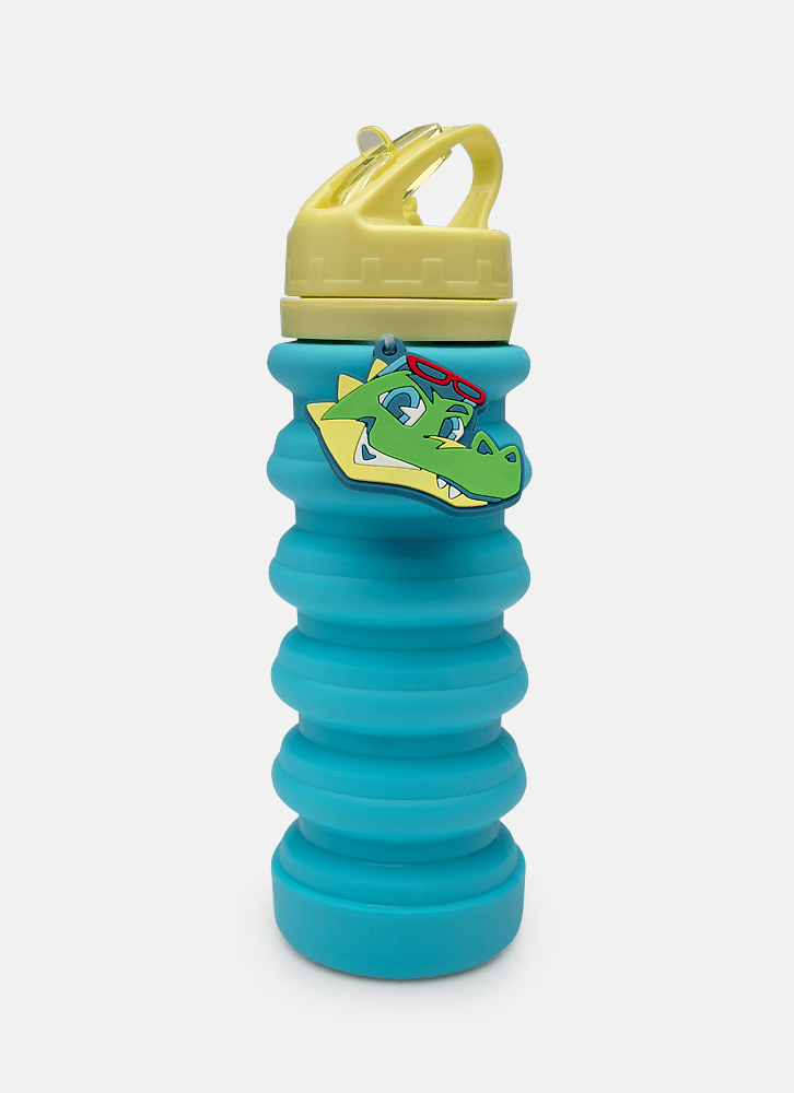 Garrafinha em silicone. Possui forma retrátil (menor quando vazia), tampa de rosquear com bico embutido e aplique emborrachado de Jaca Relax.
