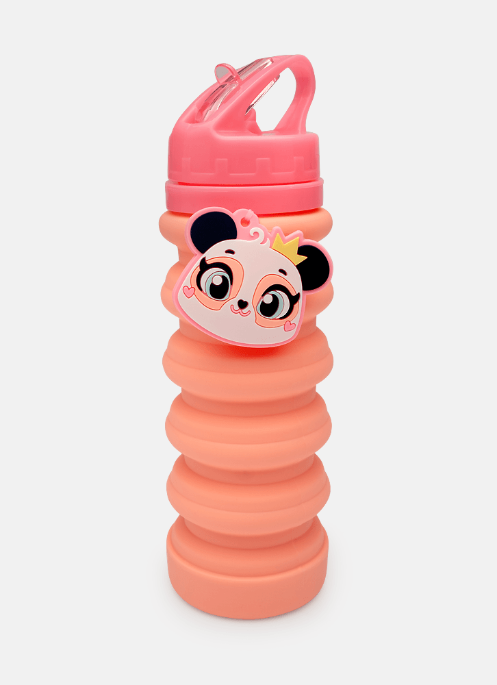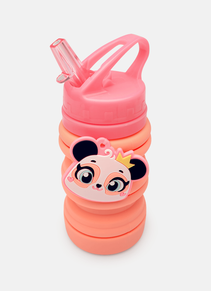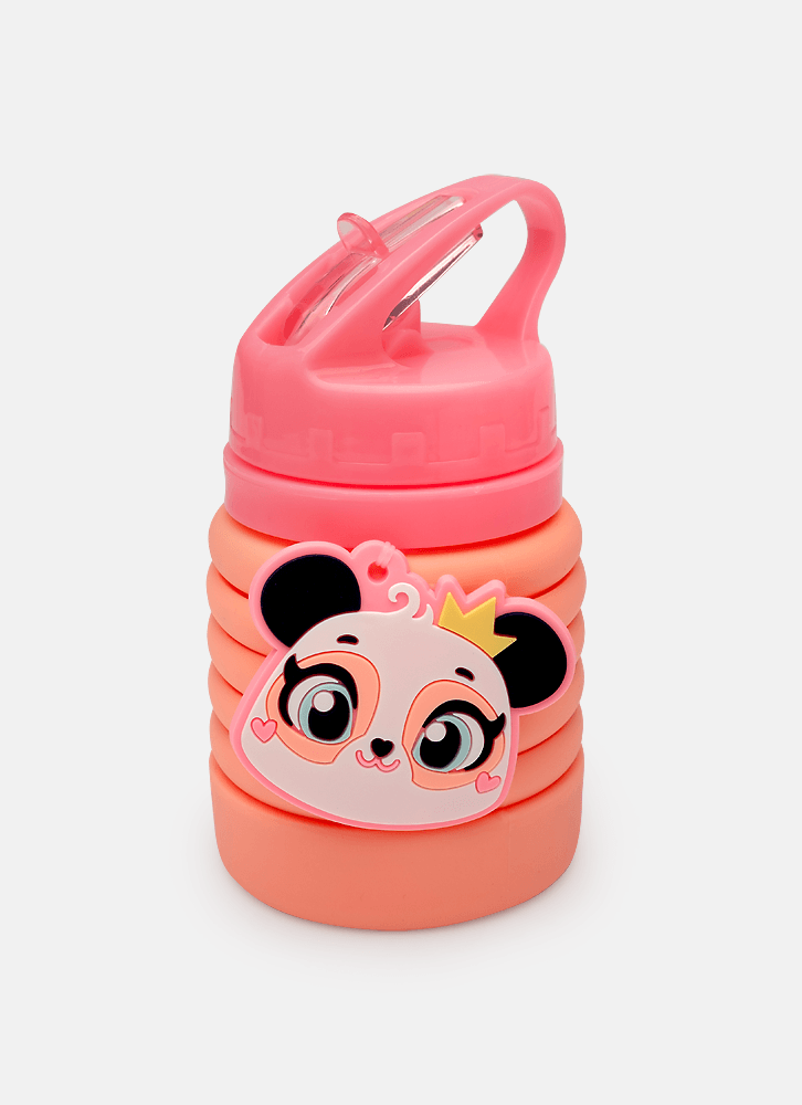 Garrafinha em silicone. Possui forma retrátil (menor quando vazia), tampa de rosquear com bico embutido e aplique emborrachado de Panda.