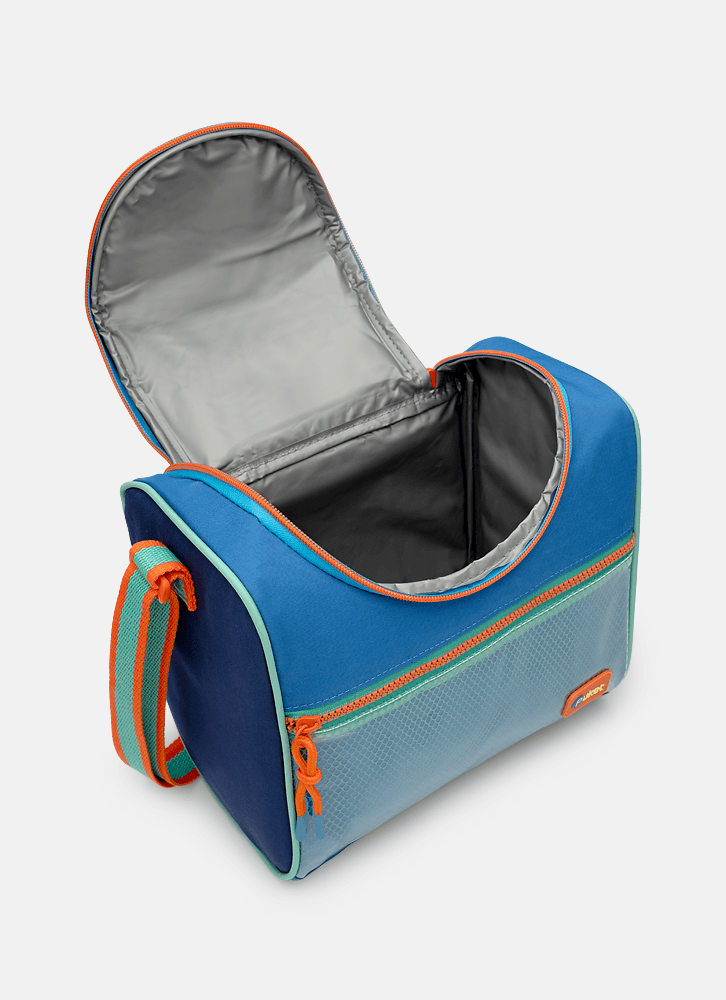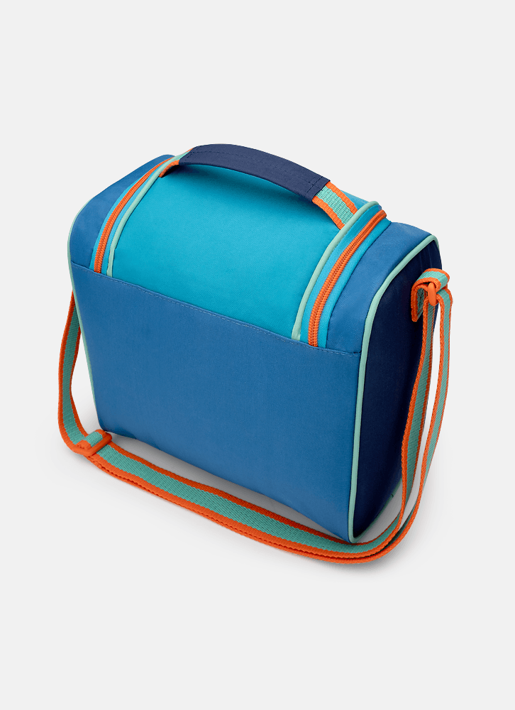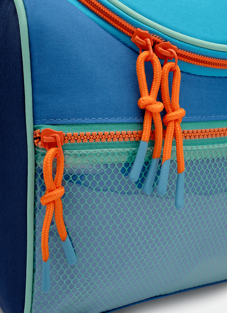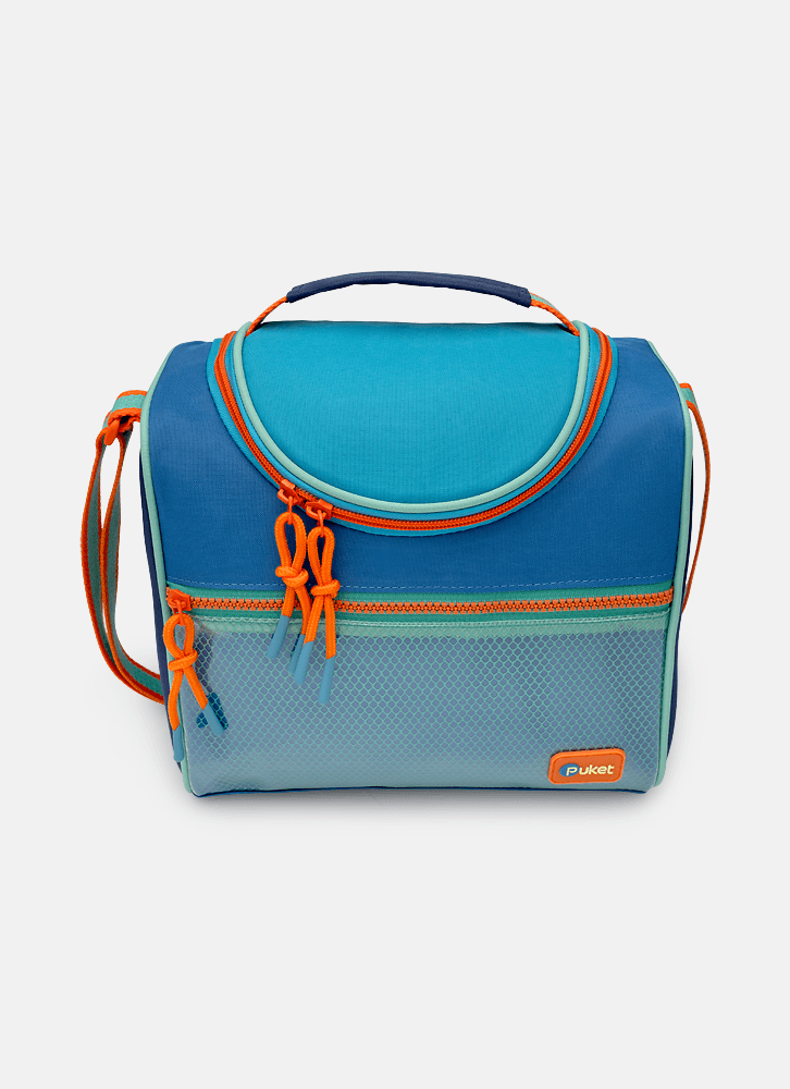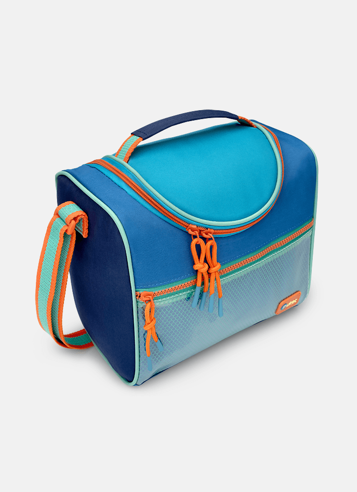 Bolsa termica Color Block em nylon. Possui bolso frontal flat em PVC telado. Alça de mão fixa e alça de ombro com regulagem. Acompanha cartela de adesivos para customização do bolso frontal.