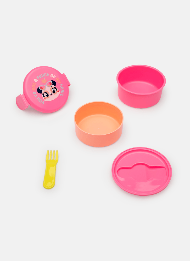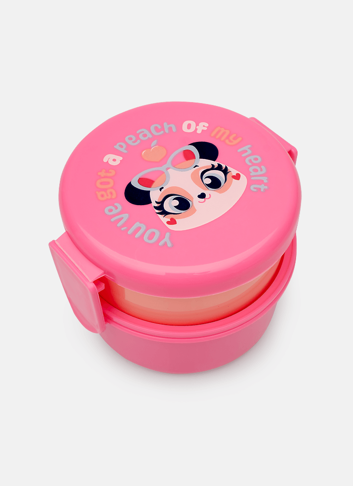 Marmita pequena em formato redondo com dois andares, tampa de encaixe com estampa de Panda Romântico. Acompanha 1 garfo de plástico