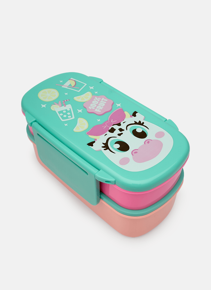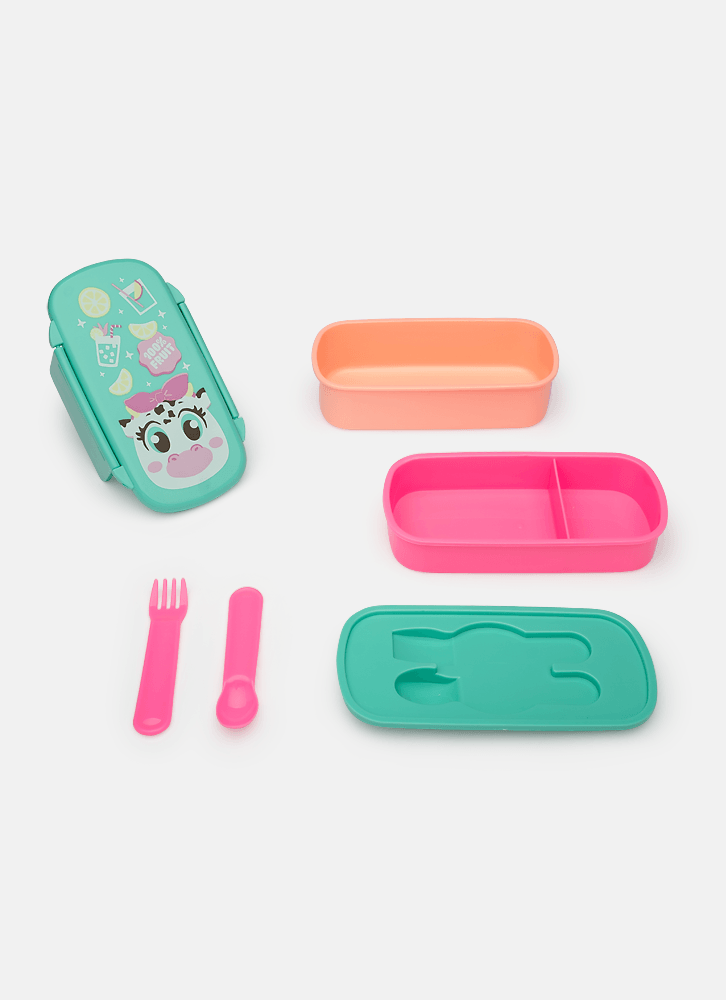 Marmita média em formato retangular de borda arredondada com dois andares, tampa de encaixe com estampa de Vaca. Acompanha 1 garfo e 1 colher de plástico.