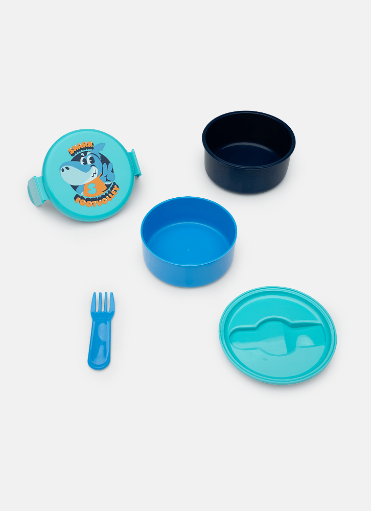 Marmita pequena em formato redondo com dois andares, tampa de encaixe com estampa de Tuba futevolei. Acompanha 1 garfo de plástico
