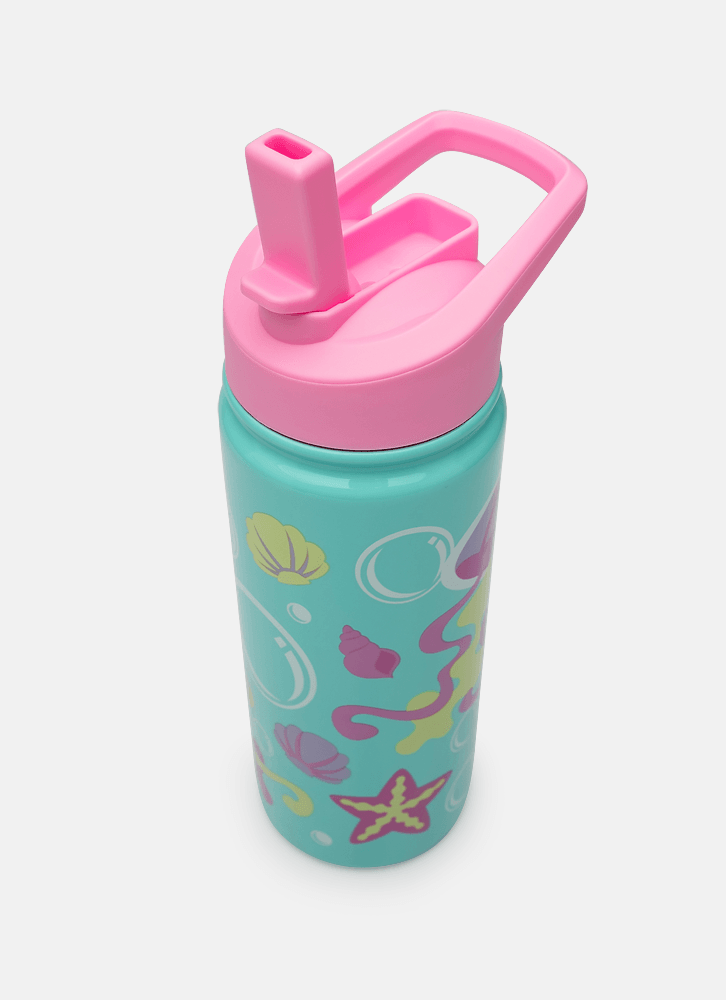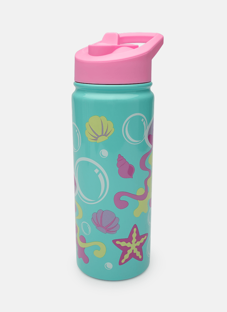 A garrafinha térmica em aço inox com estampa de Gata Sereia possui tampa de rosquear com bico retrátil de plástico.