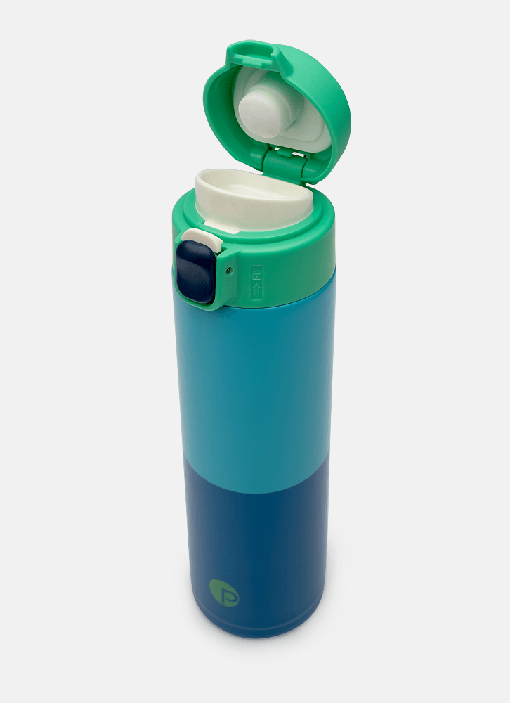 A garrafinha térmica em aço inox Color Block possui tampa de rosquear externa e tampa interna com botão (à vácuo), além de acompanhar uma cartela de adesivos para decorar.