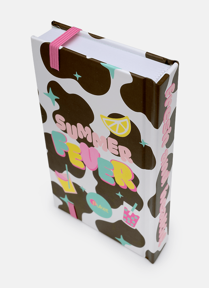 Caderno com capa dura e encadernação tipo brochura. Capa com estampa de vaca. Possui 144 páginas com pauta e detalhe de elástico para fechamento.