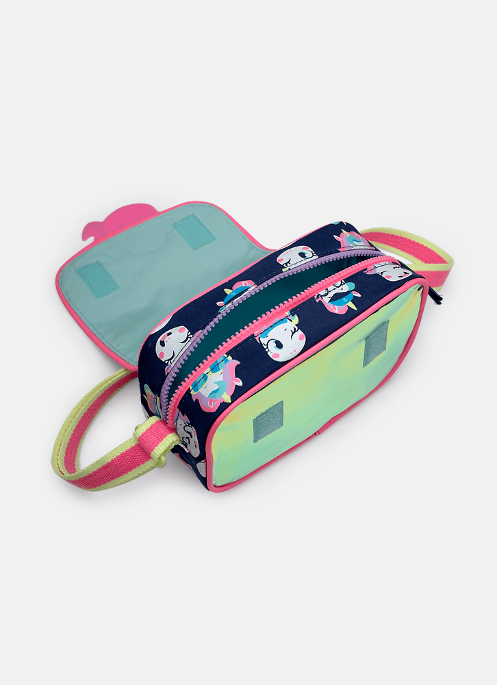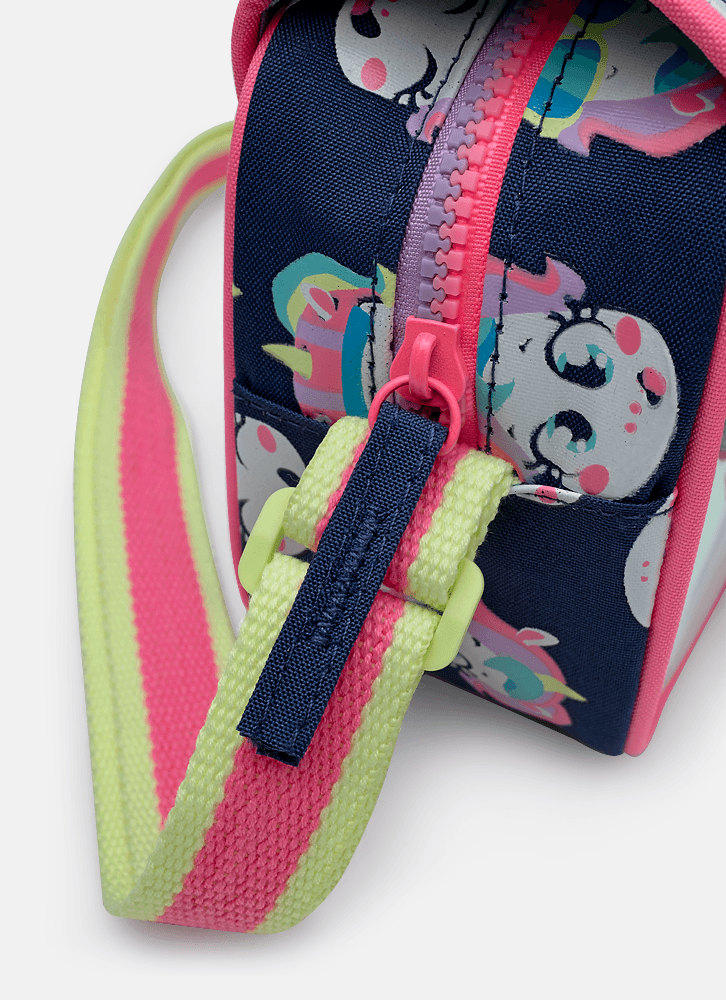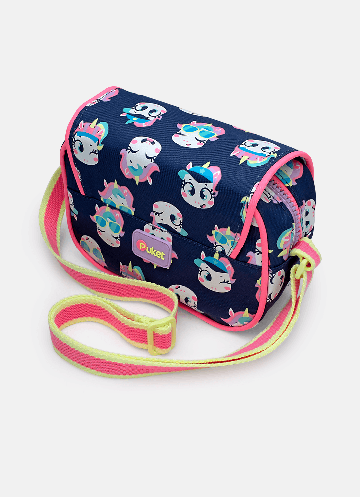 Bolsinha com bolso flap em nylon com estampa de unicórnio, parte frontal em TPU holográfico e emborrachado de unicórnio. Possui alça regulável.