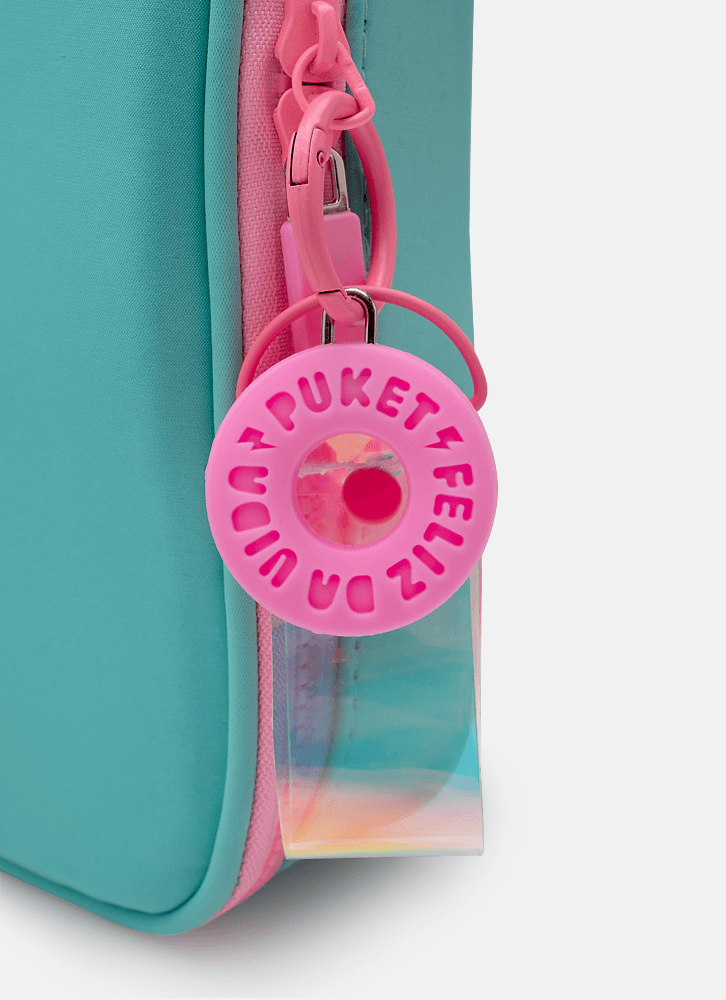 Estojo grande em nylon na cor Verde Água. Possui dois compartimentos com fechamento por zíper, aba interna com 24 elásticos para armazenamento de lápis. Parte posterior com bolso. Acompanha chaveiro diferenciado no bolso posterior