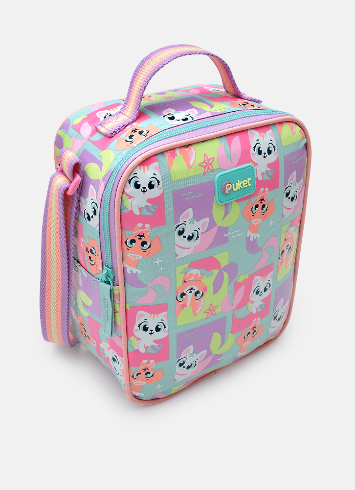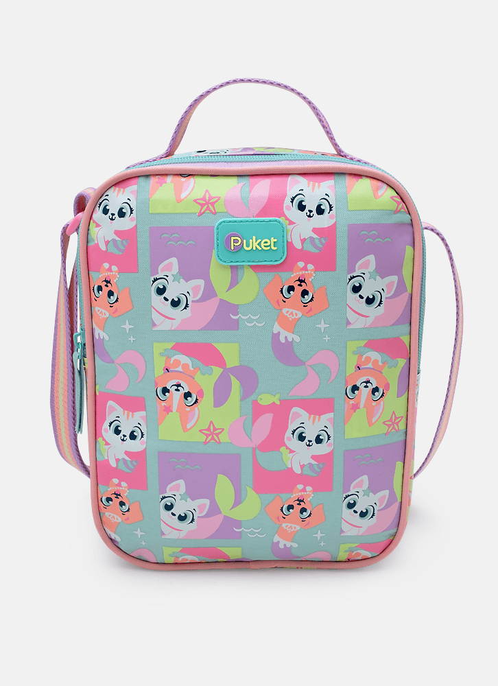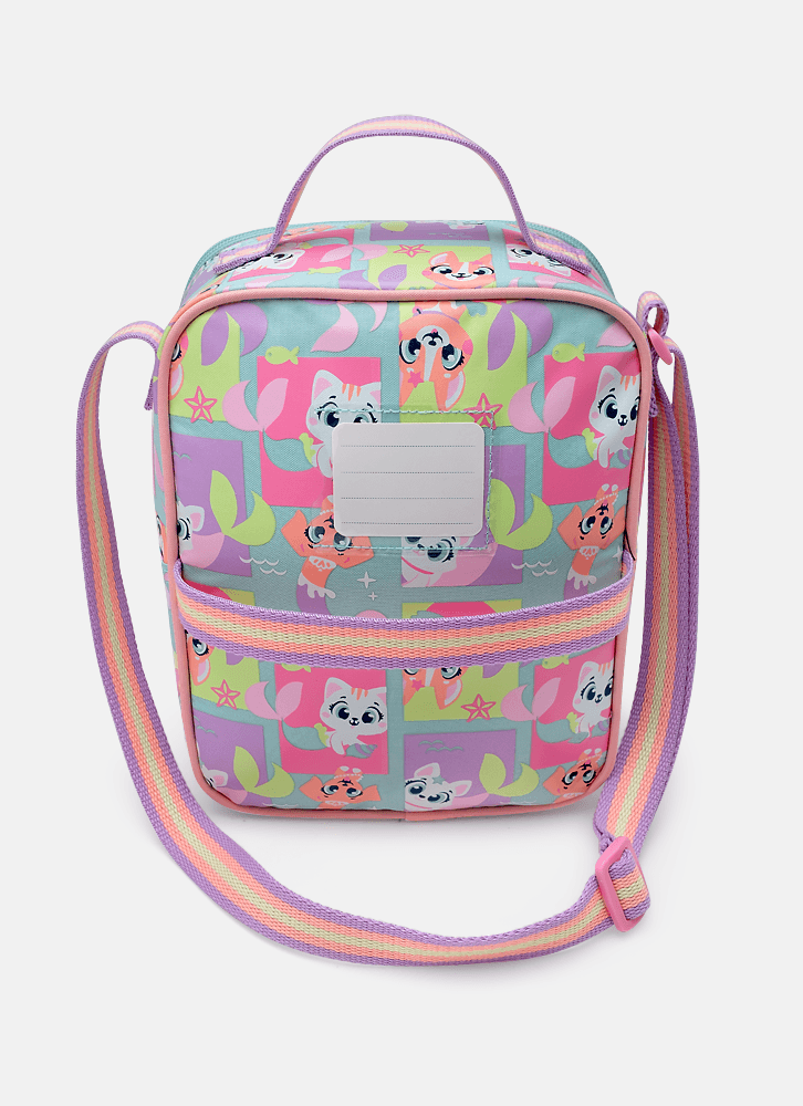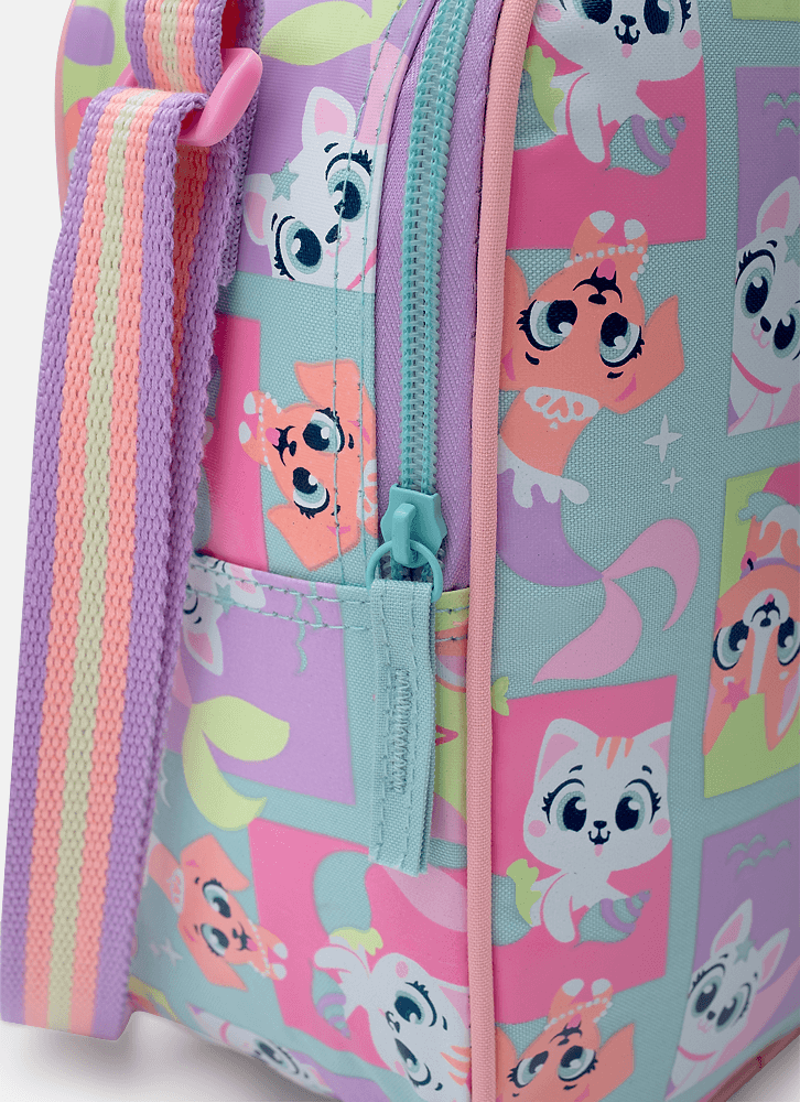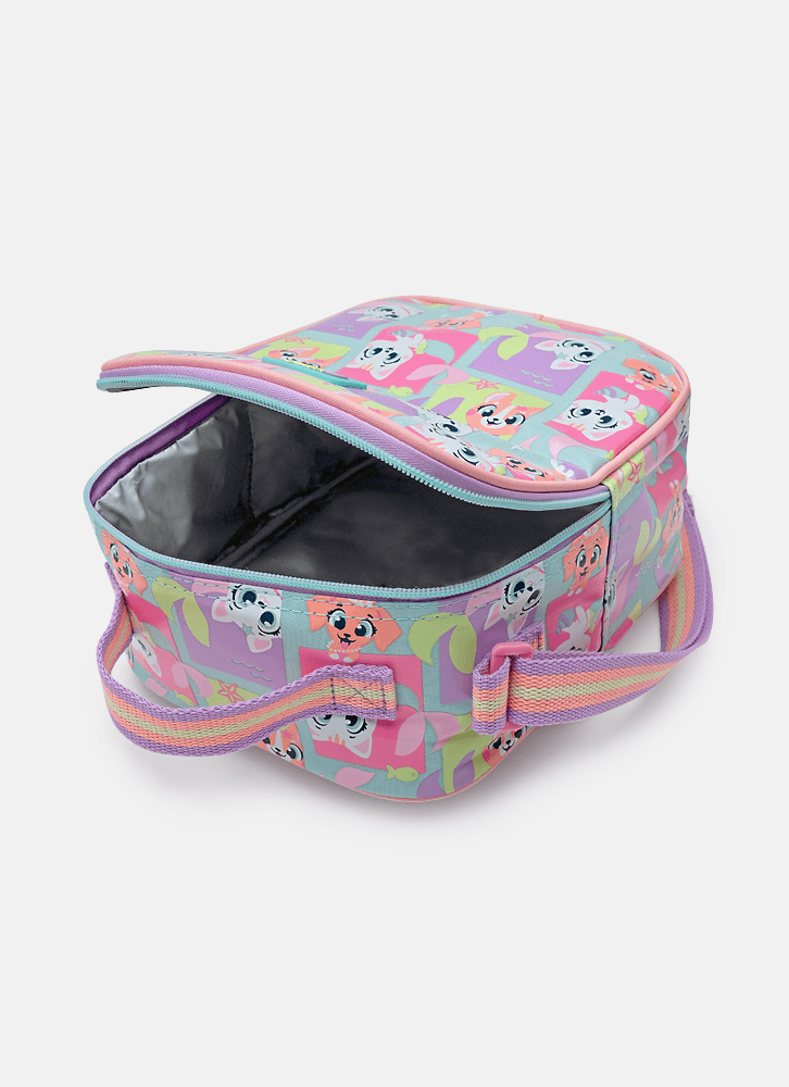 Lancheira em nylon, sem gel, com forro térmico. Possui bolso frontal médio em TPU holográfico com estampa de Pet Sereia.
