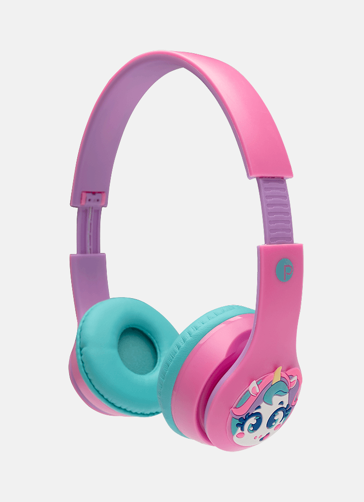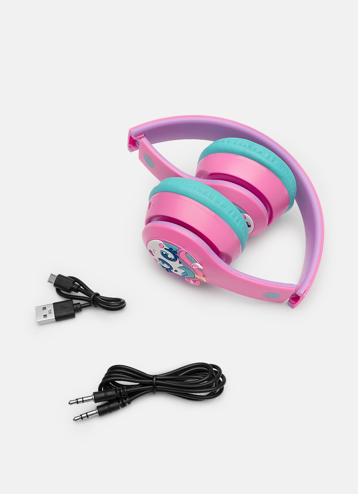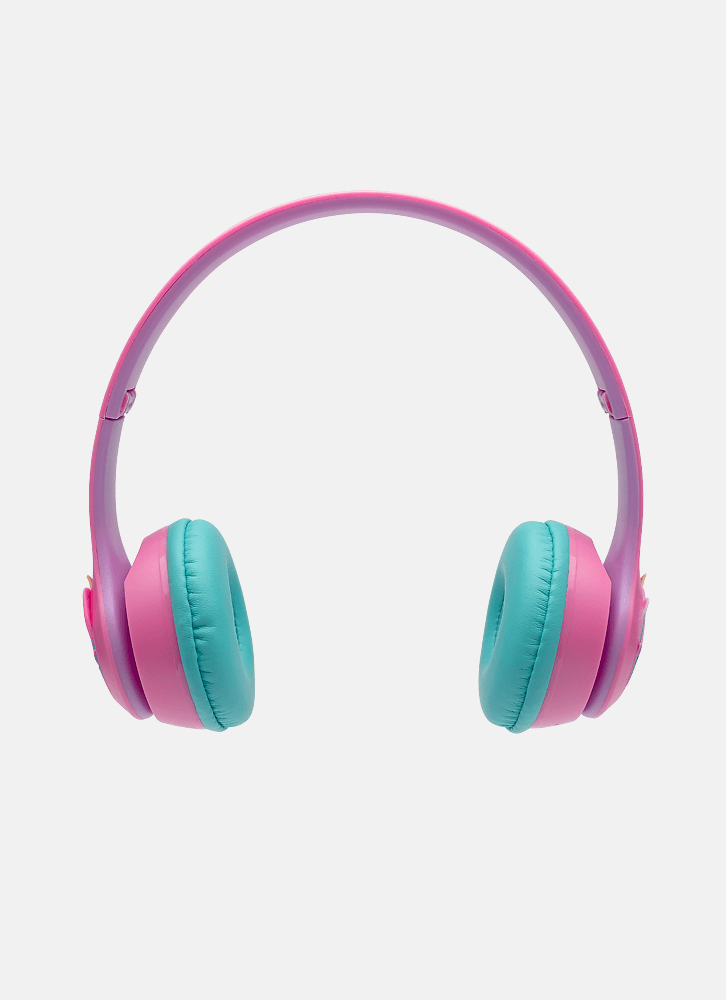 Fone de ouvido sem fio com conexão bluetooth. Detalhe de aplique emborrachado de Unicórnio com LED.