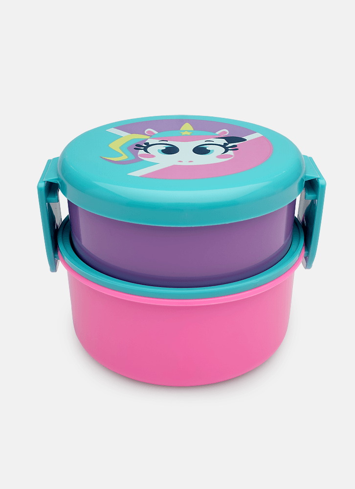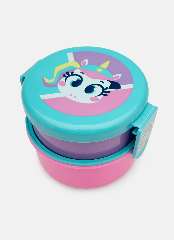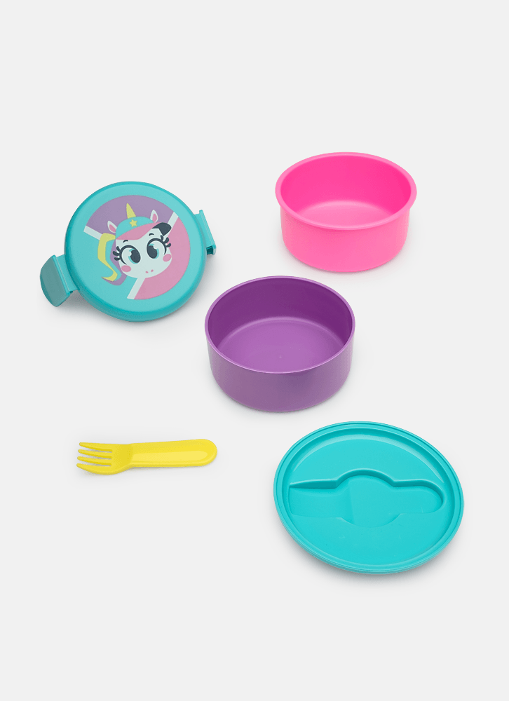 Marmita pequena em formato redondo com dois andares, tampa de encaixe com estampa de Uni Tennis. Acompanha 1 garfo de plástico