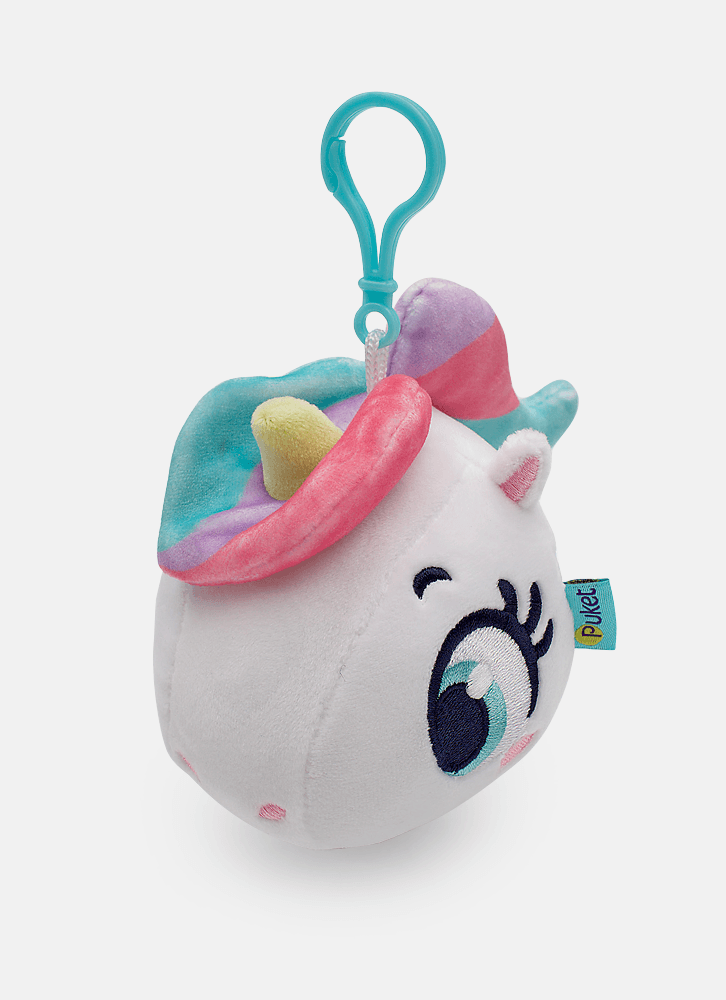 Chaveiro em pelúcia de Uni. Detalhes bordados e gancho colorido para pendurar.