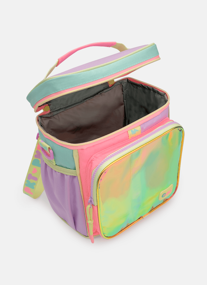 Lancheira Color Block em nylon, sem gel, e com forro térmico. Possui bolso frontal médio em TPU transparente costumizável. Bolso lateral para garrafinha. Alça de mão fixa e alça de ombro com regulagem.