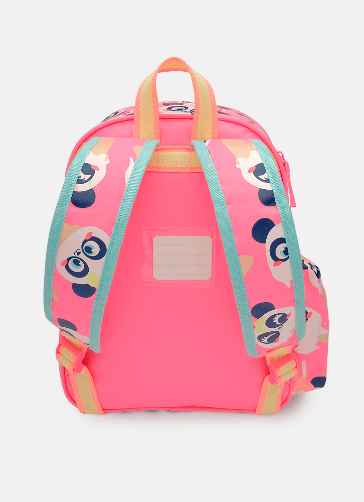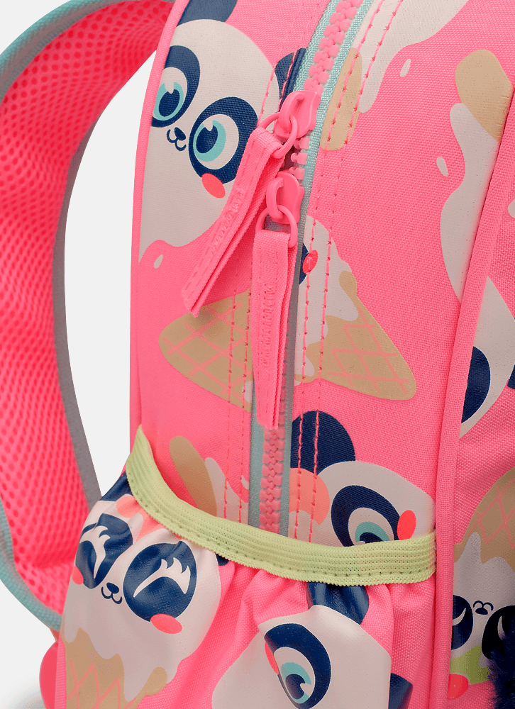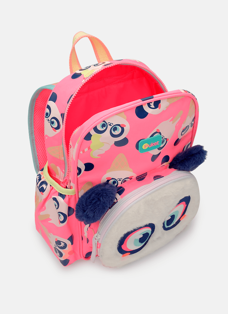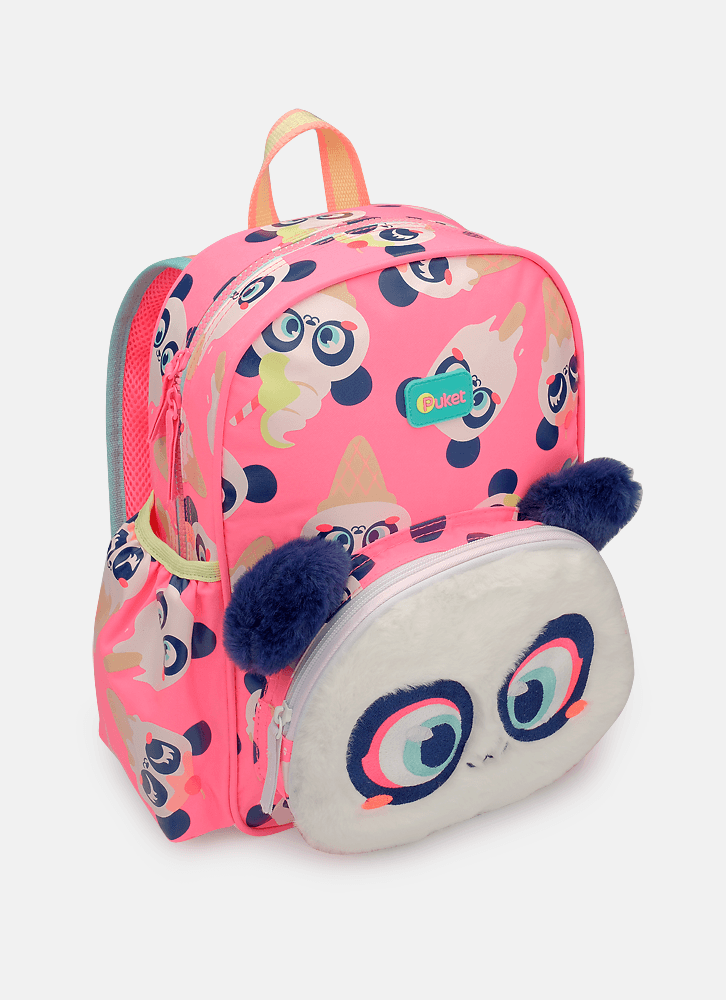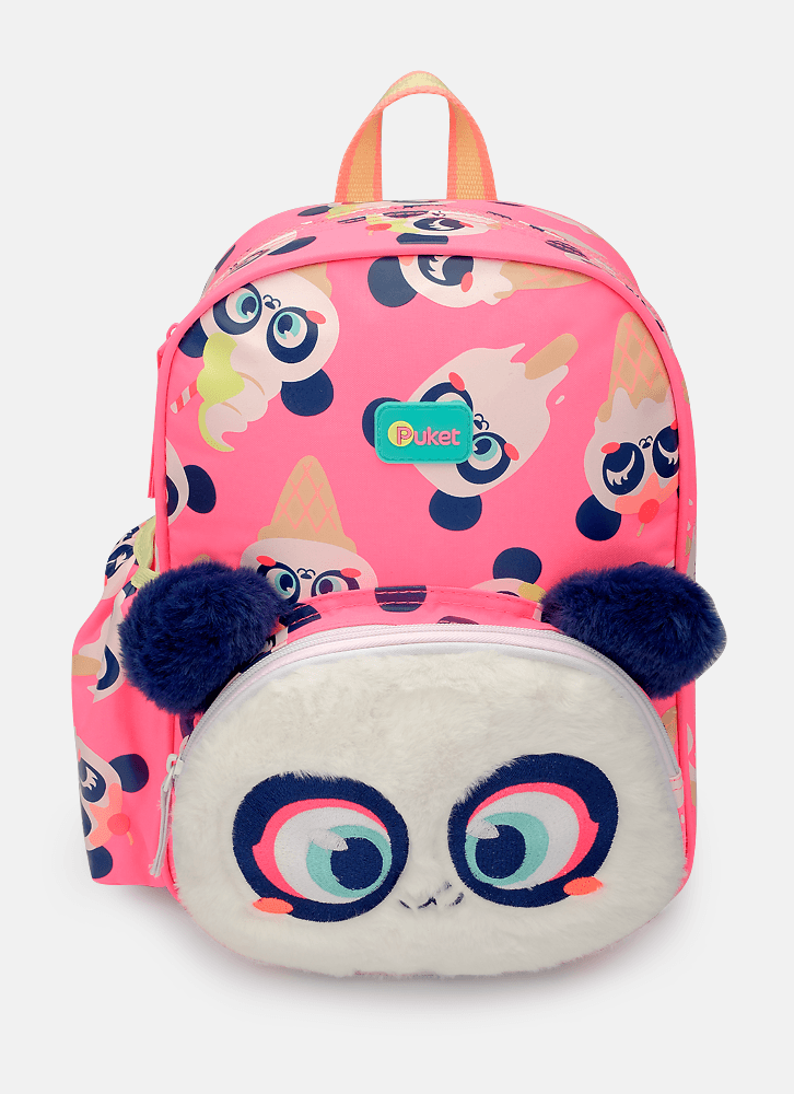 Mochila em nylon com estampa corrida de panda, bolso frontal com formato de panda em pelúcia e aplique de orelinhas. Possui bolsinho lateral para garrafinha.