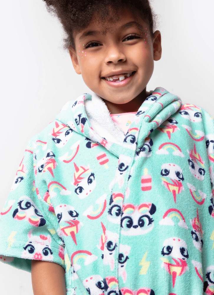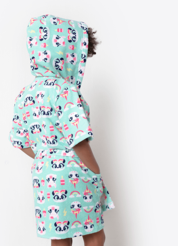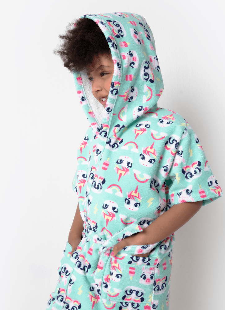 Roupão divertido com capuz, bolsos, amarração frontal e mangas 3/4 amplas. Ideal para os momentos pós banho, piscina, praia e brincadeiras com água. ** tamanho: do 2 ao 6 - Perfeito para crianças nessa faixa etária. Medidas do roupão kids: Busto: 42cm | Comprimento da manga: 44cm | Altura: 68cm Cuidados: não secar em tambor; não passar; não limpar a seco; não deixar a peça de molho; não torcer a peça; lavar à mão com sabão neutro e água corrente após o uso; secar à sombra; não guardar a peça molhada em sacos (mais informações, vide na etiqueta). Garantia: Deverá ser encaminhado dentro da embalagem original, sem indícios de uso, acompanhado da nota fiscal e com todos os itens constantes na solicitação de troca.