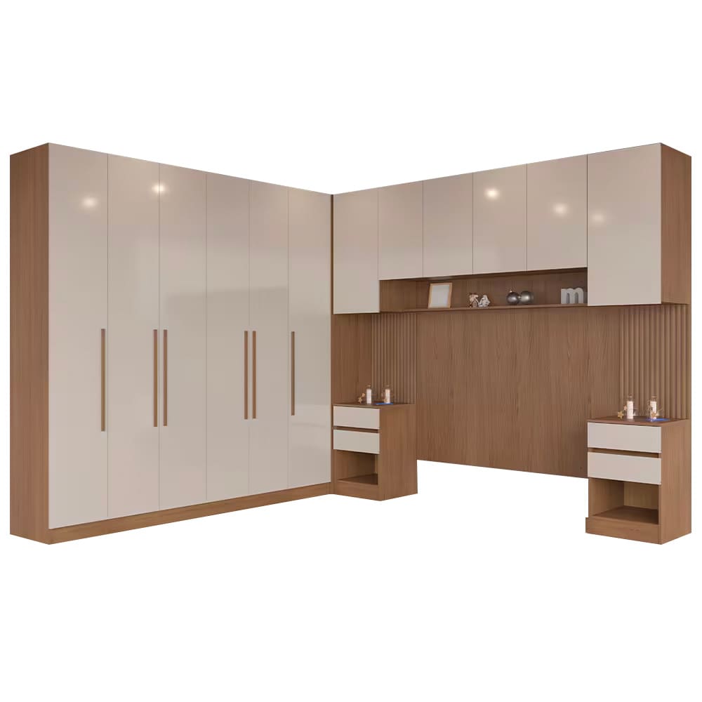 Este Guarda-roupa Queen Modulado da Bartira é a escolha ideal para você. Feito de material MDP resistente, ele possui 12 portas, 7 gavetas e 16 prateleiras. Este conjunto é composto por 2 Armários Modulado, 1 Armário Modulado de canto, 1 módulo ponte indicado para o tamanho queen size e 2 armários laterais.