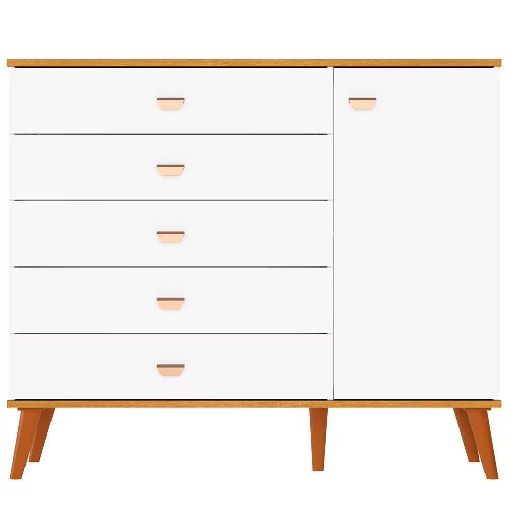 A Cômoda Infantil Bartira Ternura complementa o ambiente com 5 gavetas espaçosas e 1 porta com prateleira interna, perfeita para armazenar objetos maiores ou itens decorativos. Também fabricada em MDP FF, possui corrediças telescópicas que proporcionam abertura suave e silenciosa, além de um visual elegante e funcional.