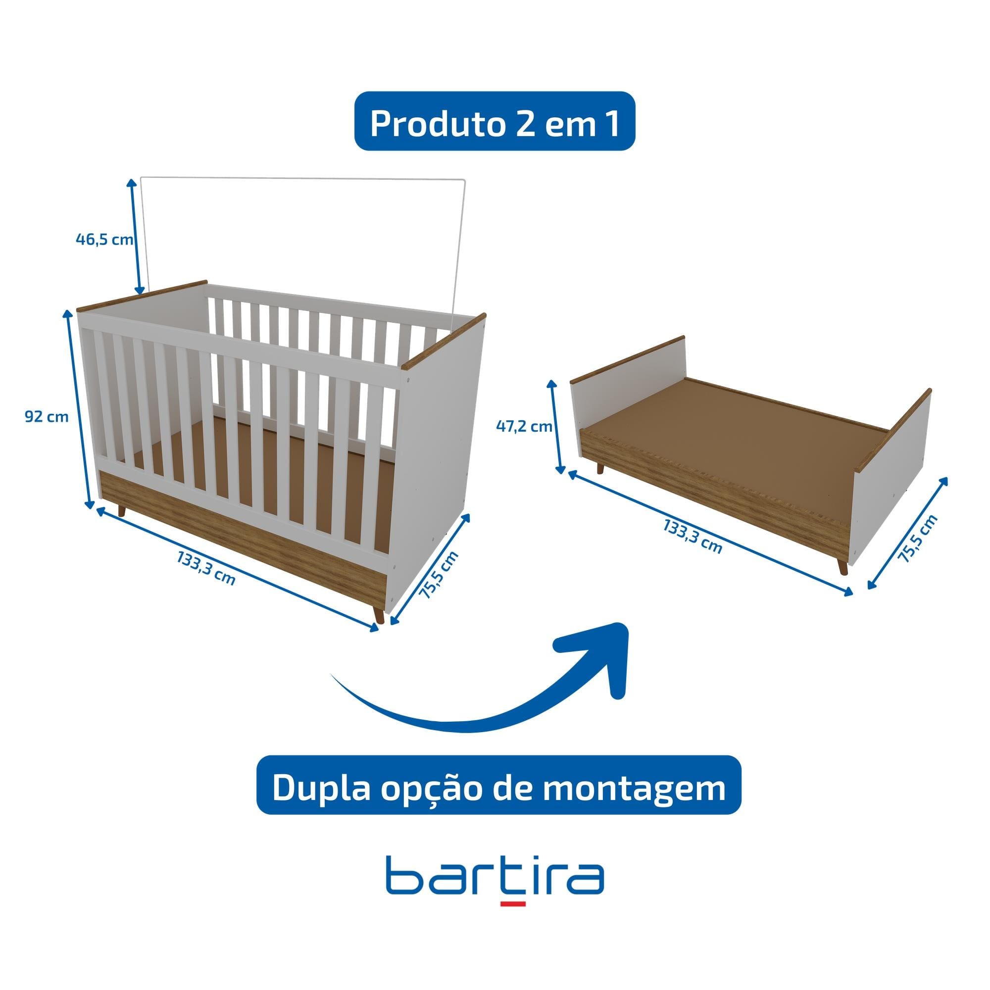 O Berço 2 em 1 Bartira Ternura Plus é a escolha ideal para acompanhar o crescimento do bebê. Com estrutura em MDP de alta qualidade e acabamento FF, ele se transforma em mini cama, possui cantos arredondados, pés plásticos e haste metálica para mosquiteiro. Certificado pelo INMETRO, oferece segurança e conforto desde os primeiros dias.