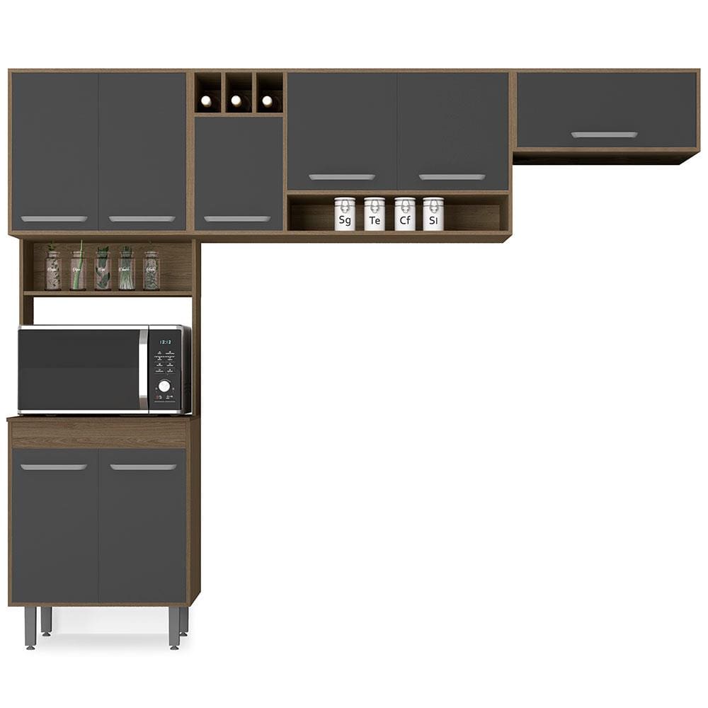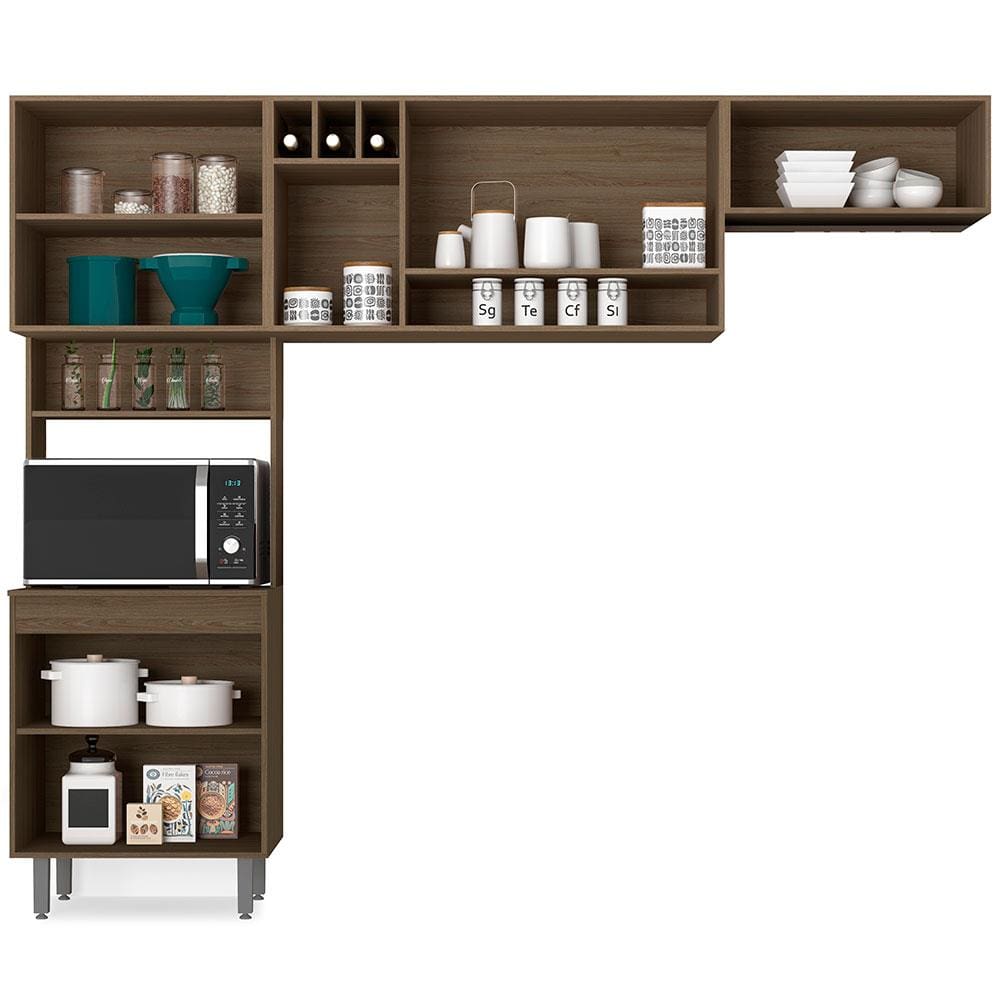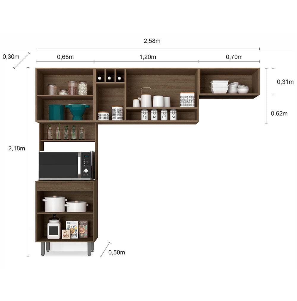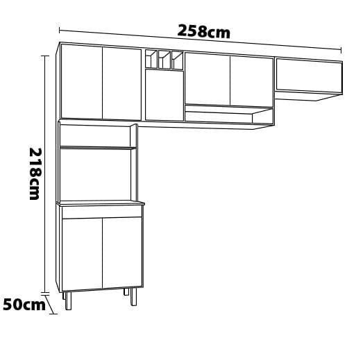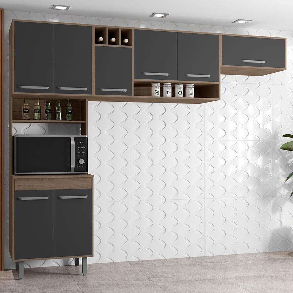 Feita em MDP, ela conta com amplo espaço interno, portas embutidas, paneleiro com portas de bater, prateleiras internas e nicho para micro-ondas. O armário aéreo conta com porta basculante com pistão a gás o que permite uma abertura mais suave o que mantém a porta suspensa podendo ser usado sobre a geladeira ou fogão, dobradiças reforçadas de 26mm nas portas e puxadores modernos em polímero.