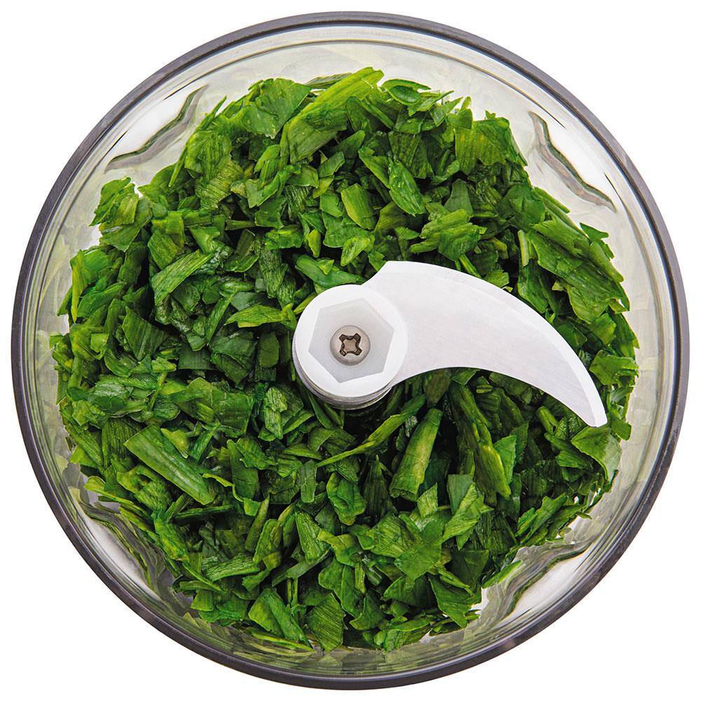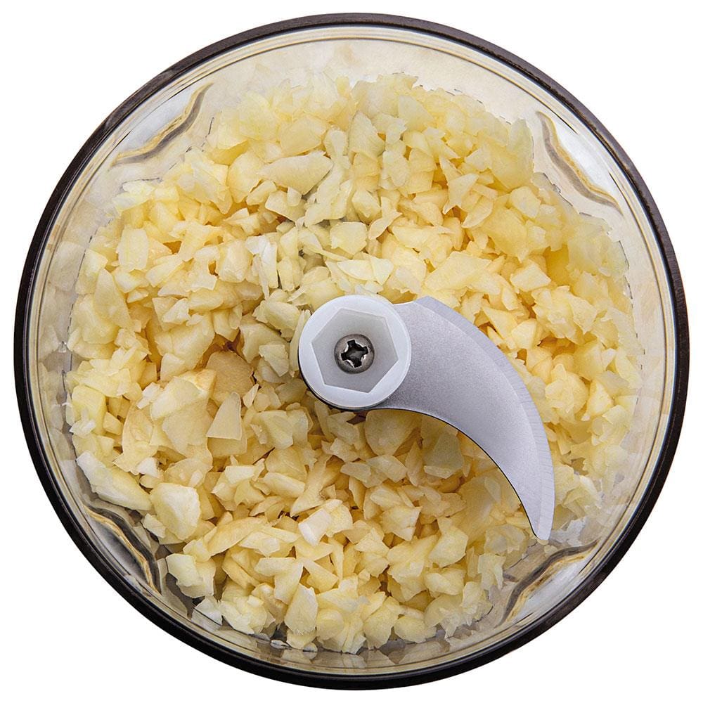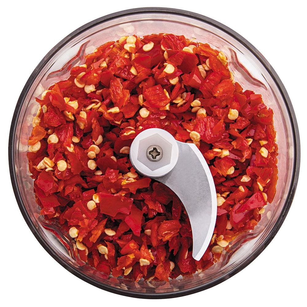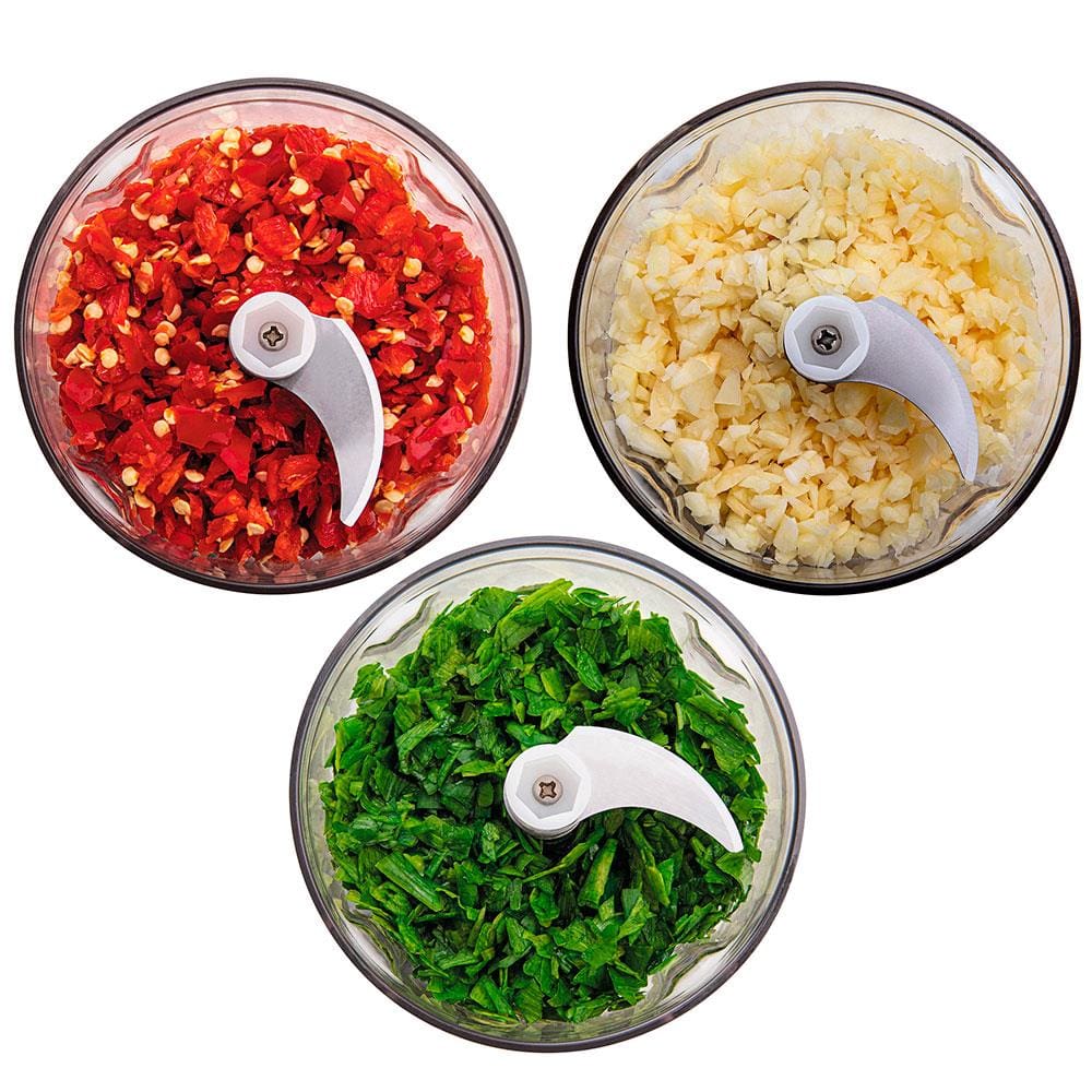 O equipamento também pode ser utilizado para triturar cebola, pimenta, cebolinha, frutas e legumes. O conjunto de lâminas é removível e super fácil de limpar, sem complicações.