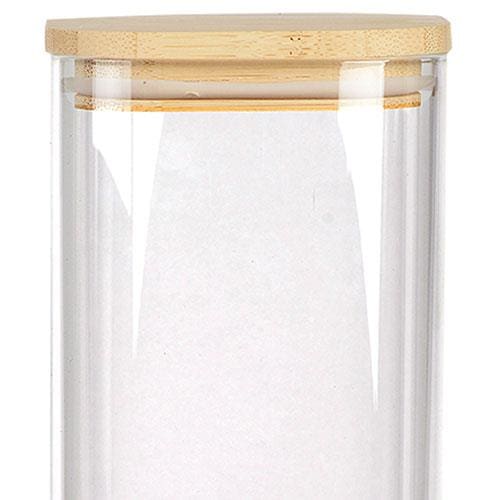 O pote é feito em vidro resistente e possui tampa de bambu com vedação de silicone que garante um fechamento hermético, conservando melhor os mantimentos.