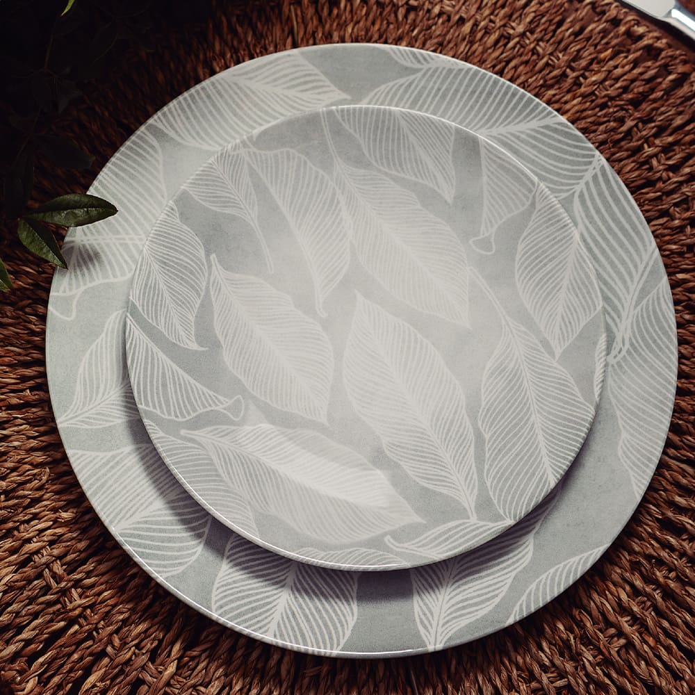 -Fabricado em porcelana tradicional Tramontina e acabamento externo em esmalte, cada peça possui porosidade próxima de zero e decoração inspirada na natureza, com folhas brancas delicadamente caídas sobre o fundo que imita pedra, trazendo assim, um toque contemporâneo para cada refeição.