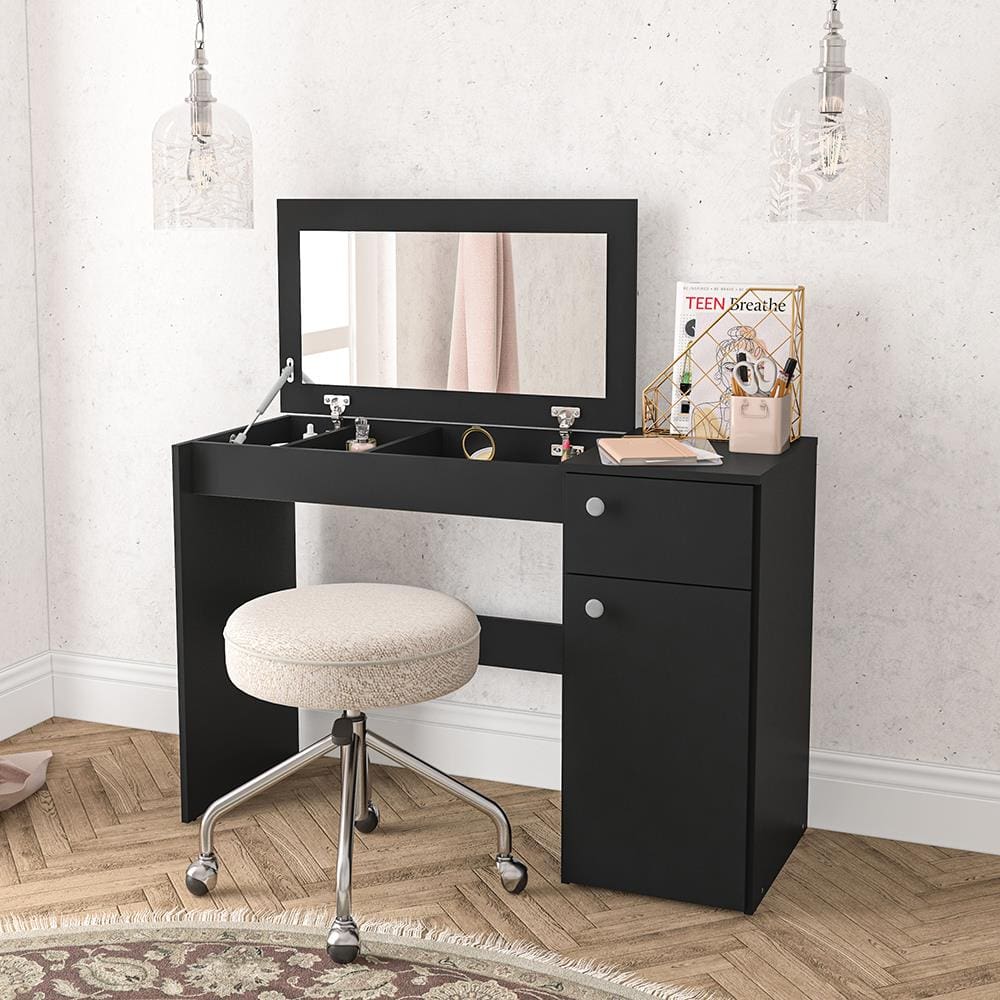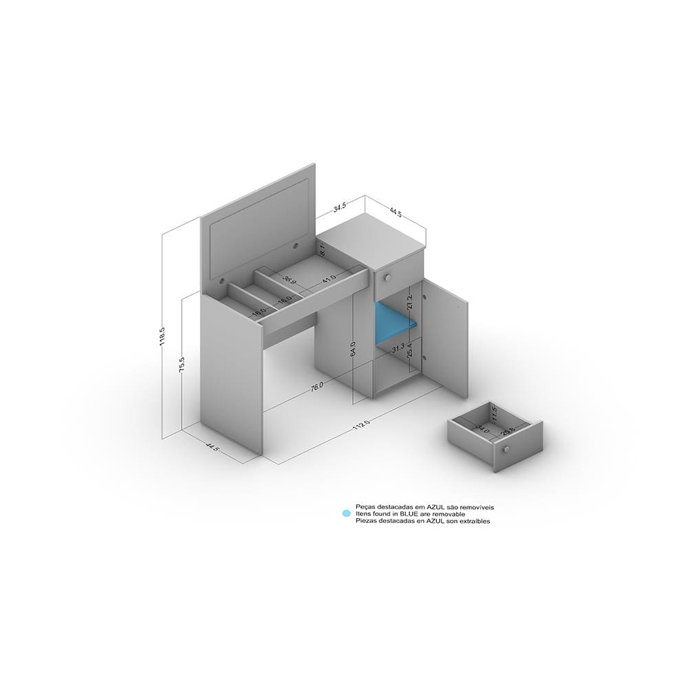 - Design multifuncional: penteadeira e escrivaninha no mesmo móvel.