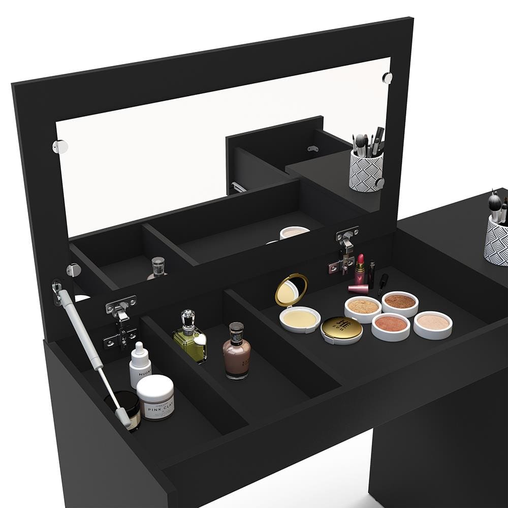 Produzida em MDP de alta qualidade com pintura UV, a Iracema oferece resistência, durabilidade e um acabamento sofisticado. Seu tampo com pistão possui abertura superior, revelando um espelho embutido e nichos internos que facilitam a organização de cosméticos, joias e acessórios pessoais.