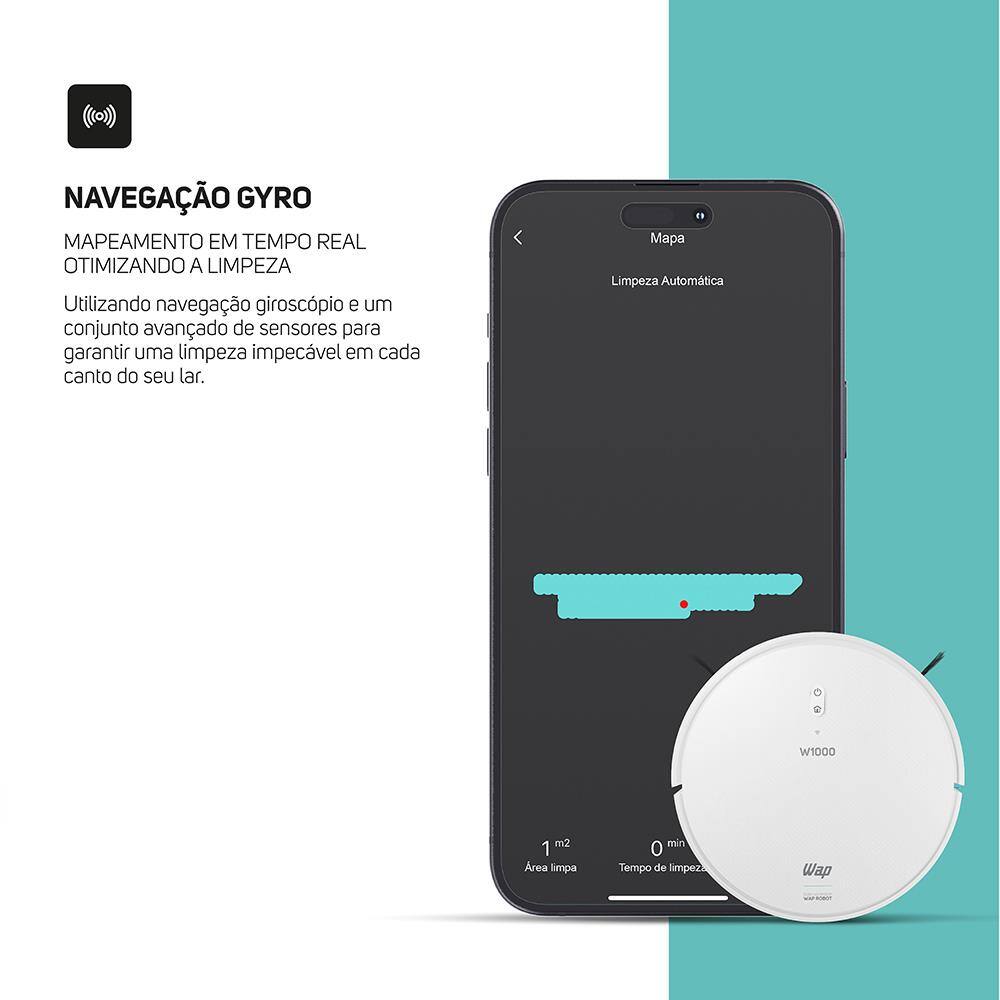 O Robô Aspirador Wap Robot W1000 transforma sua rotina de limpeza com tecnologia de ponta e controle total na palma da mão. Por meio do aplicativo WAP Connect, você pode acompanhar e programar a limpeza dos ambientes diretamente do celular, além de atualizar o software, agendar tarefas e até comandá-lo por voz via Alexa ou Google Assistant. Sua navegação Gyro exclusiva calcula com precisão a posição e direção em tempo real, garantindo uma movimentação eficiente e segura que evita obstáculos no caminho.