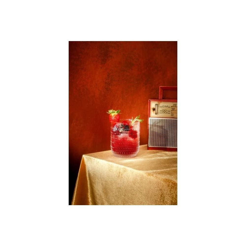 Esse conjunto é composto por 6 copos modelo On The Rocks, para servir whisky, negroni, spritz, campari soda e outros drinks gelados. Sua estrutura mais baixa e bojo largo permite o uso com bastante gelo, além de também ser perfeito para servir sobremesas, verrines doces ou salgados.