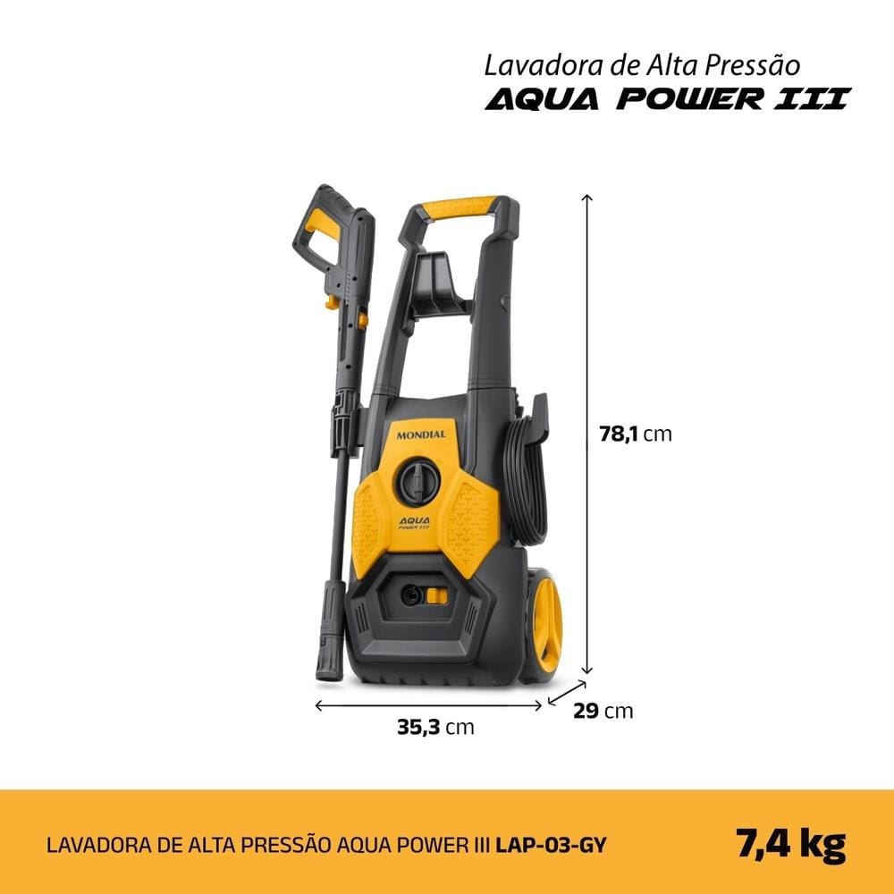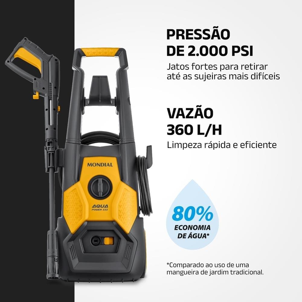 Lavadora Alta Pressão Mondial Power III 1800W 2000 PSI 360L/h Mangueira 5m Detergente Amarela e Cinza