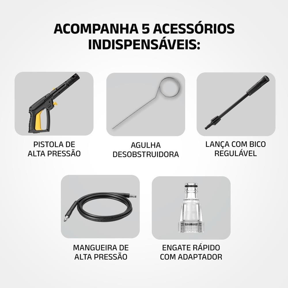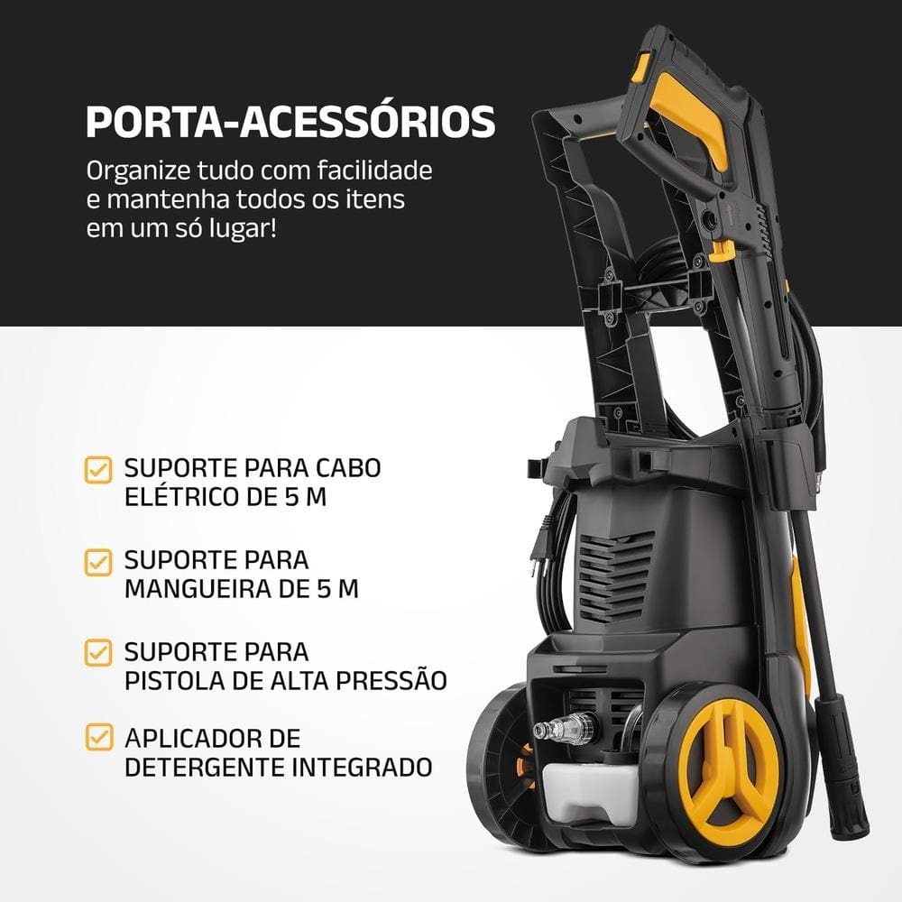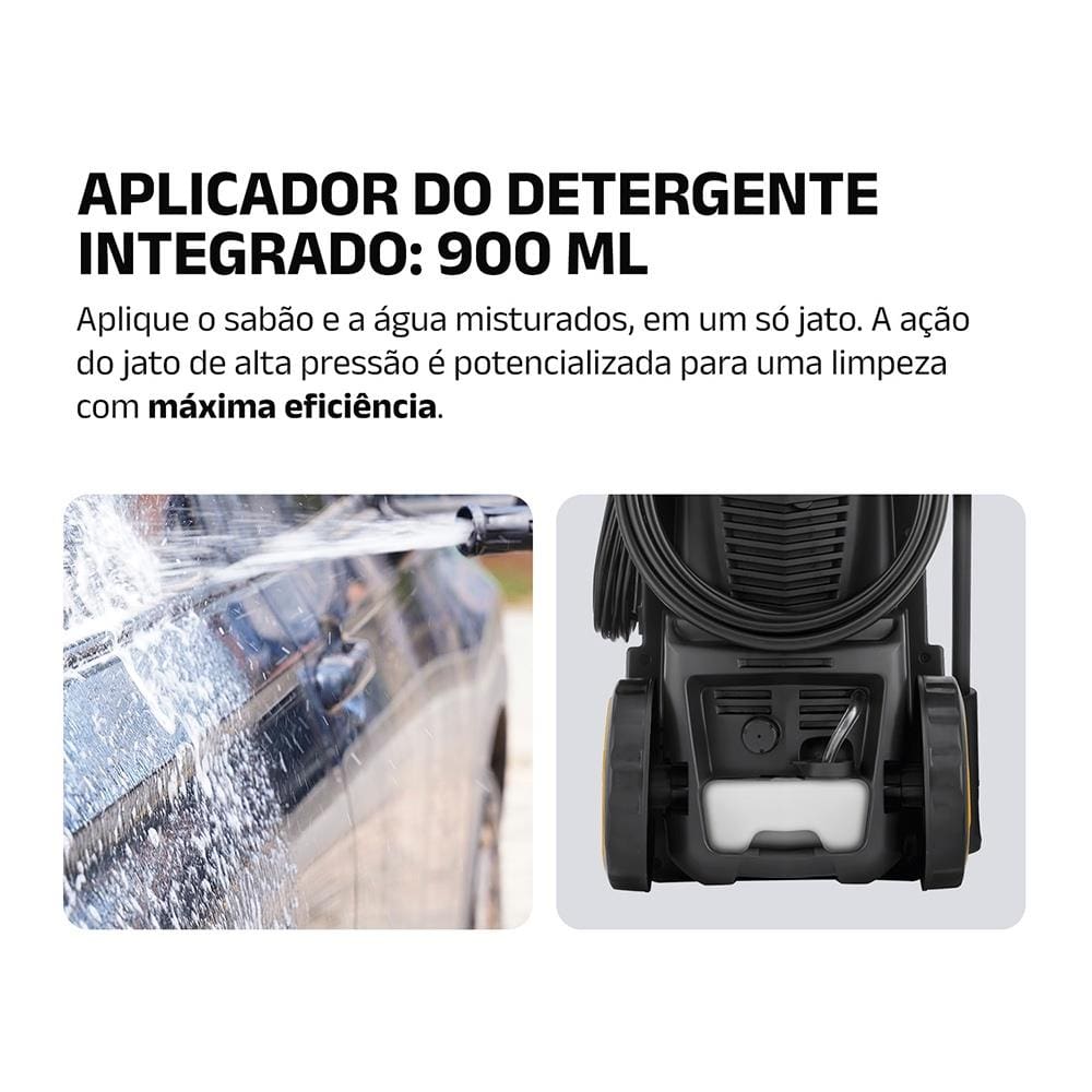 Seu motor de 1.800W garante durabilidade e ótimo desempenho, enquanto o engate rápido facilita a conexão da mangueira, prevenindo vazamentos e otimizando o uso. A lavadora também permite o uso com detergente, facilitando a lavagem de veículos, pisos e áreas com sujeiras engorduradas.Eu quero