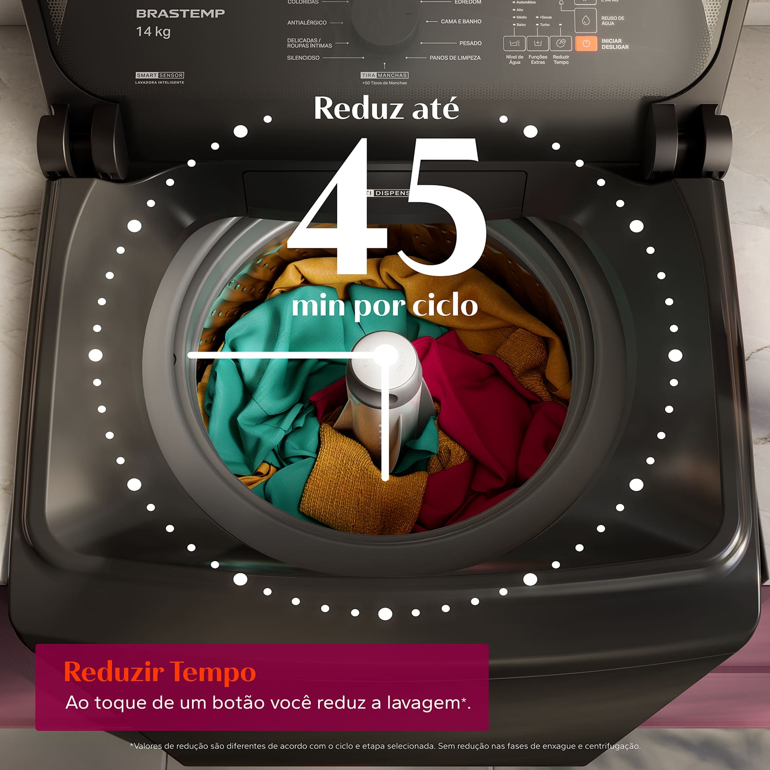 Transforme sua rotina com a Lavadora 14kg da Brastemp, a escolha inteligente para quem busca praticidade, economia e alto desempenho. Com Smart Sensor, ela ajusta automaticamente o nível de água e a agitação conforme o peso das roupas, economizando até 25% de água. E se o tempo é precioso, a função Reduzir Tempo permite encurtar o ciclo em até 45 minutos com apenas um toque.