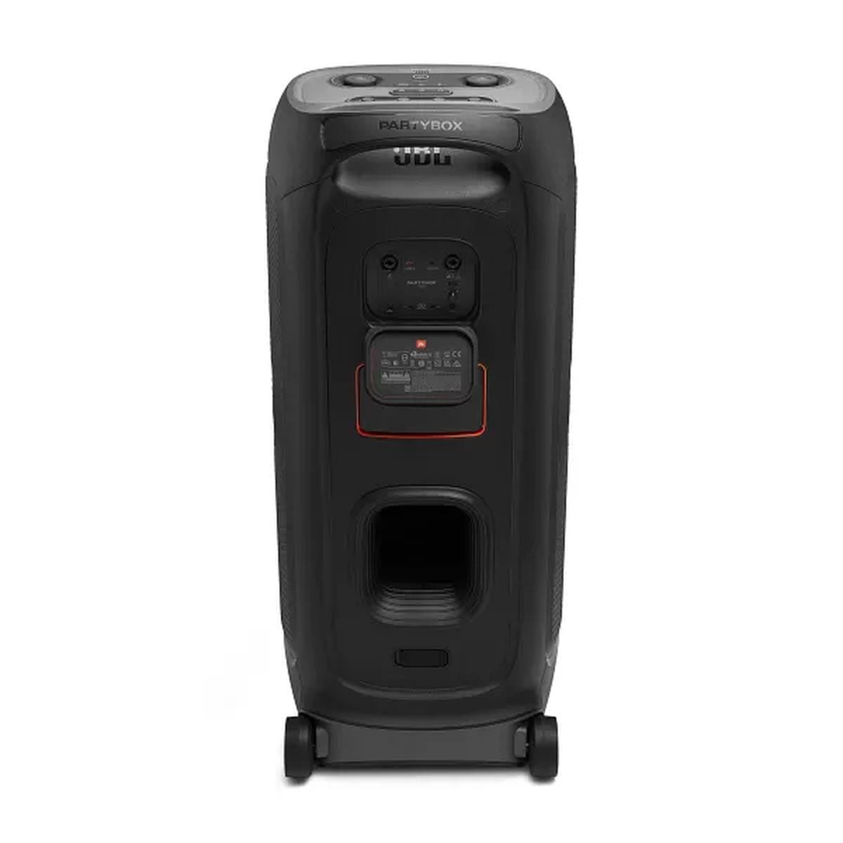 A conectividade é completa, com Bluetooth, USB-C Lossless, entrada AUX, conexão para fone de ouvido, entradas XLR e duplas entradas para microfone e instrumentos, além de Daisy Chain e Auracast. Tudo pode ser controlado pelo App JBL PartyBox.