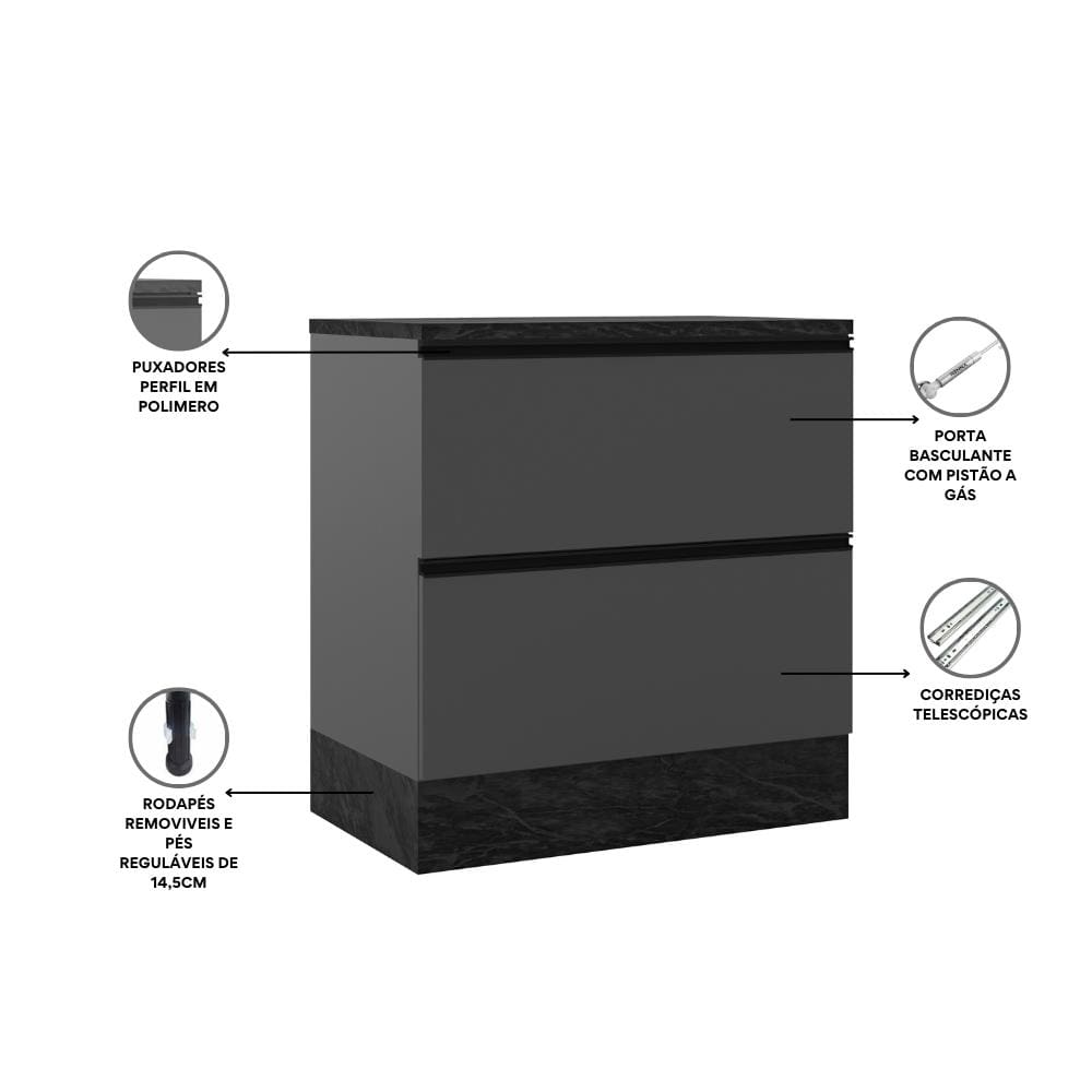 Conta com 1 porta basculante equipada com pistão a gás, garantindo abertura e fechamento suaves, além de 1 gaveta com corrediças telescópicas que permitem abertura total e melhor aproveitamento do espaço.