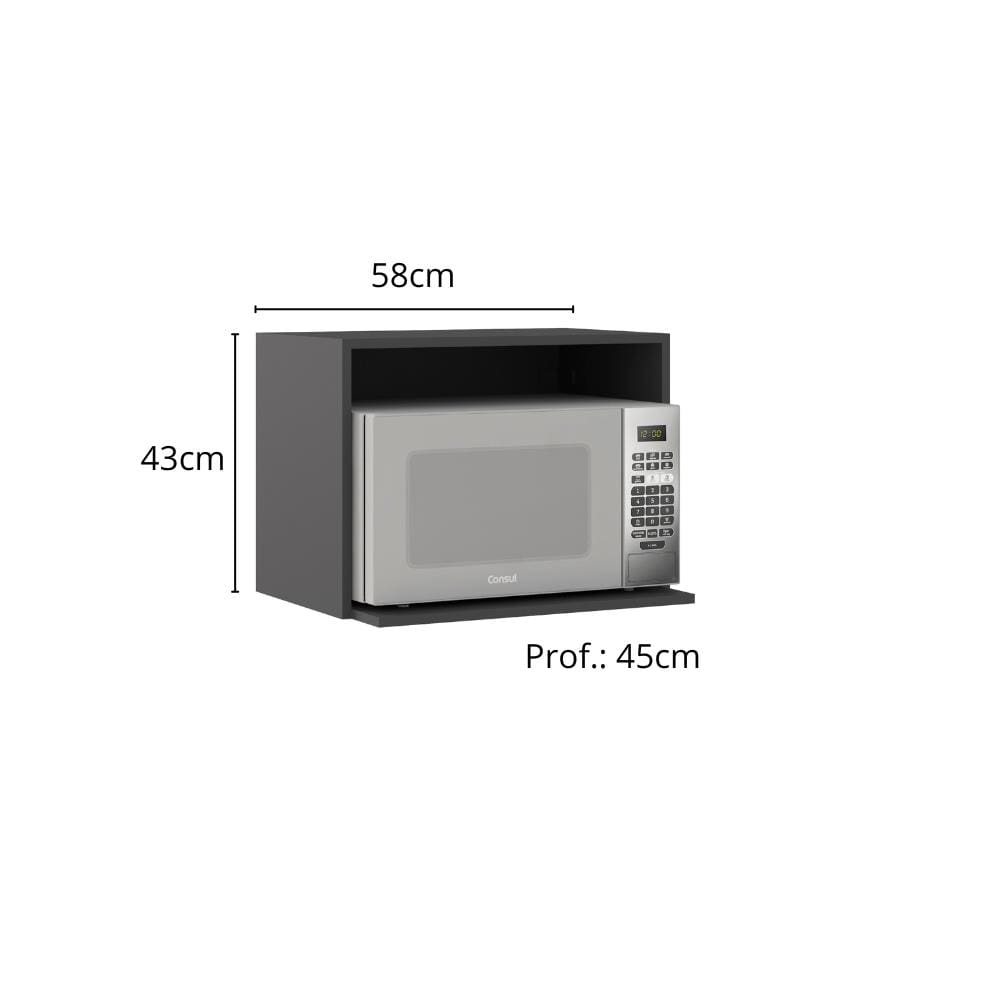Projetado para acomodar micro-ondas ou forno dentro da medida limite de A.39cm x L.55cm x P.45cm, proporciona uma instalação funcional e segura no ambiente.