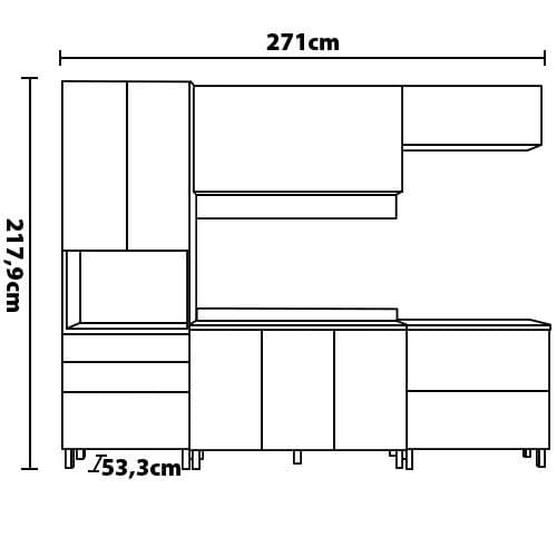 Conteúdo da Embalagem: - 1 Cozinha Completa Bartira Amazonita com 9 Portas, 4 Gavetas e 7 Prateleiras - 271,2cm de largura