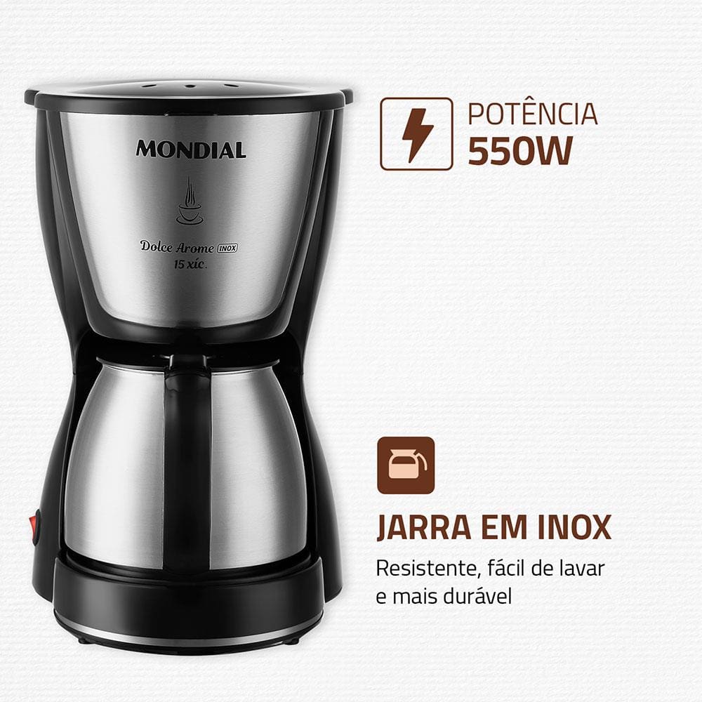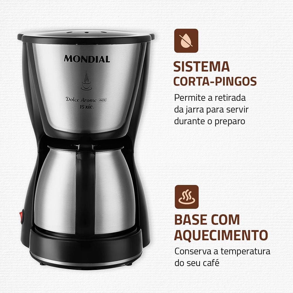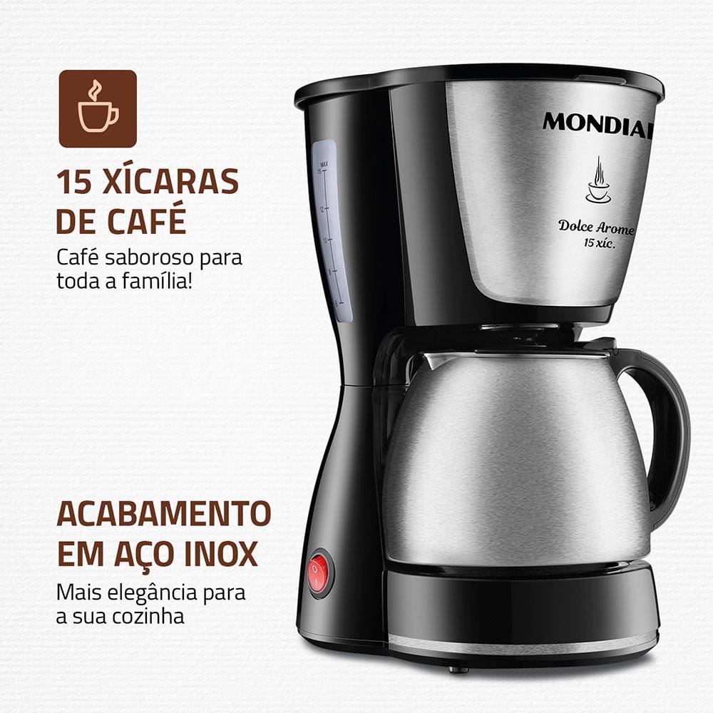 Para despertar, receber visitas com carinho ou finalizar com dia com mais disposição, o café é uma grande pedida e para fazer um café com qualidade, rapidez e praticidade a Cafeteira Elétrica Mondial Dolce Arome Inox C-34. Moderna, bonita e com jarra de inox, ela tem capacidade para fazer até 15 xícaras de uma só vez.