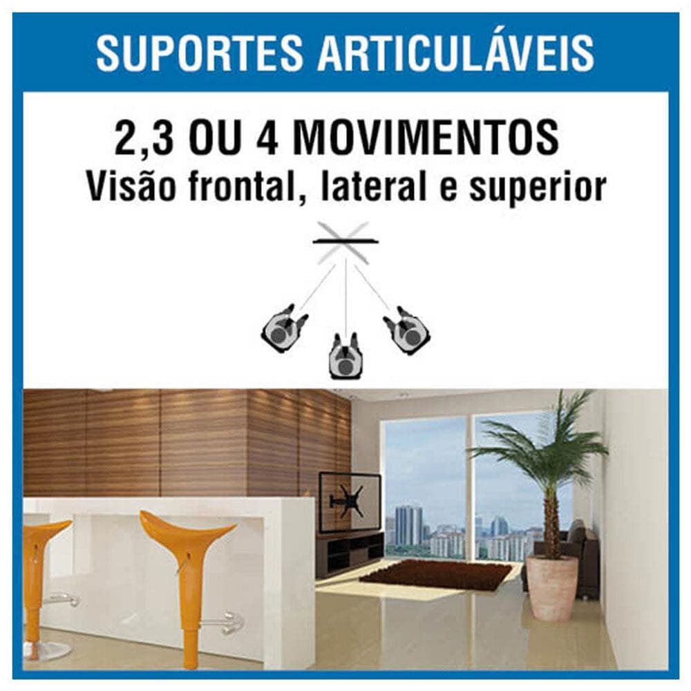 Como o próprio nome já diz, ele é articulado, também permitindo inclinação e rotação em 3 movimentos. Na prática, isso significa ter uma visão mais completa do que está sendo reproduzido, independente de onde você estiver sentado. Ideal para ambientes que costumam receber grande quantidade de pessoas. Para isso, sua articulação permite até 130°, enquanto a inclinação vai até 15°.