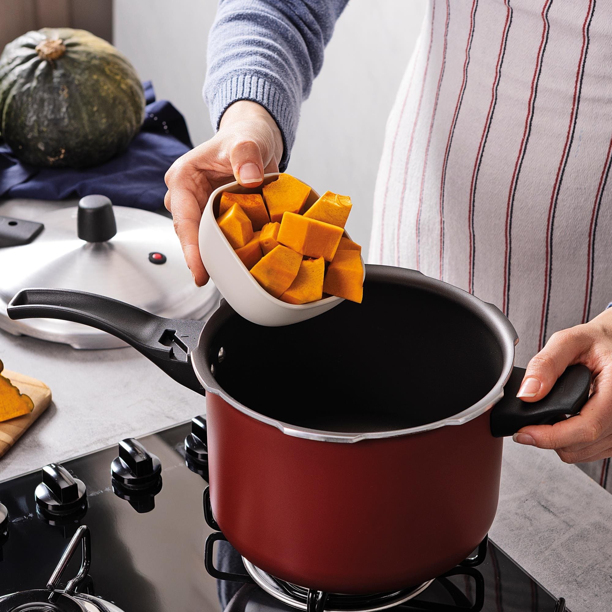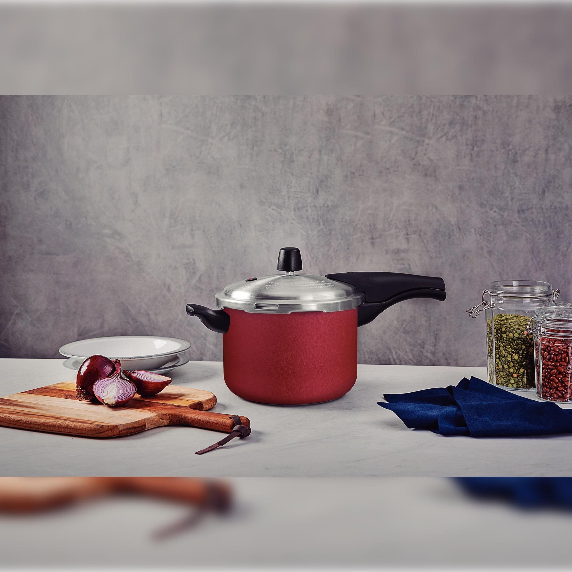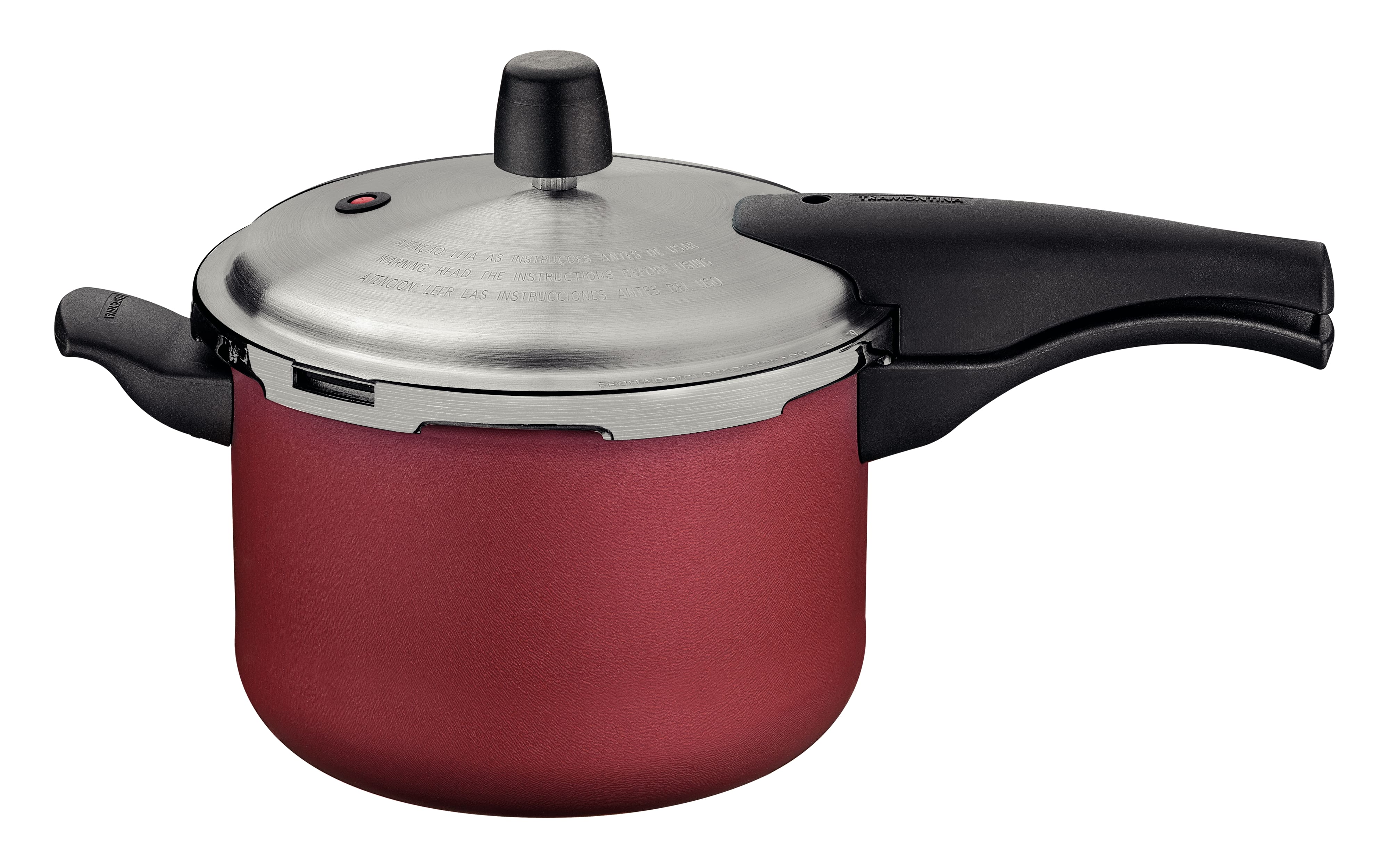 Conteúdo da Embalagem: -1 Panela de Pressão Tramontina Vancouver Effect com Revestimento Antiaderente Starflon Vermelha - 4,5 litros.
