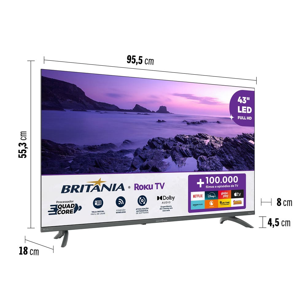 Conteúdo da embalagem: -Smart TV DLED 43" Full HD Britânia BTV43VA4REGB Roku TV com HDMI, USB, Wi-Fi, Dolby Audio, Processador Quad-Core e Conexão com Alexa; -Controle remoto; -Cabo de alimentação AC; -Guia de Início Rápido em Português; -Parafusos da base e Base.