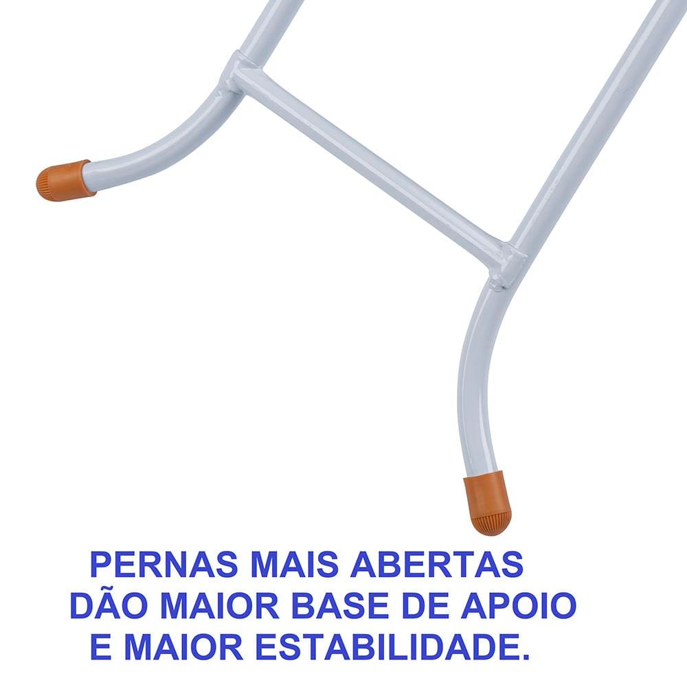Projetada para garantir segurança, a mesa conta com pernas bem abertas e ponteiras antiderrapantes, que proporcionam firmeza durante o uso. Além disso, possui um prático porta-ferro em tubo com encaixe, ideal para apoiar o ferro de forma segura e otimizar o espaço enquanto realiza as tarefas domésticas.