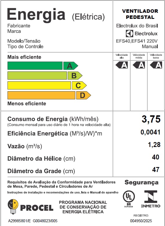 O selo Procel A de eficiência energética garante alto desempenho com baixo consumo, inclusive na velocidade Turbo. São 3 opções de velocidade: Mínima, para operação silenciosa; Média, que reduz o consumo em até 20%; e turbo - para máxima potência de ventilação.A montagem prática com cliques facilita a desmontagem para limpeza ou armazenamento. Conta ainda com ajuste de inclinação vertical e botão oscilante, permitindo direcionar o fluxo de ar de forma fixa ou distribuída lateralmente.
