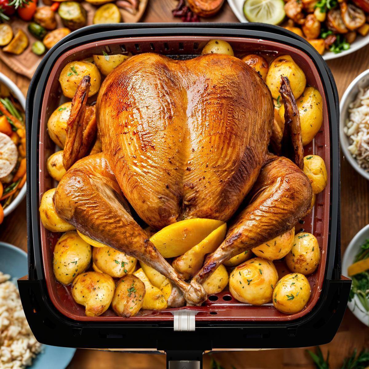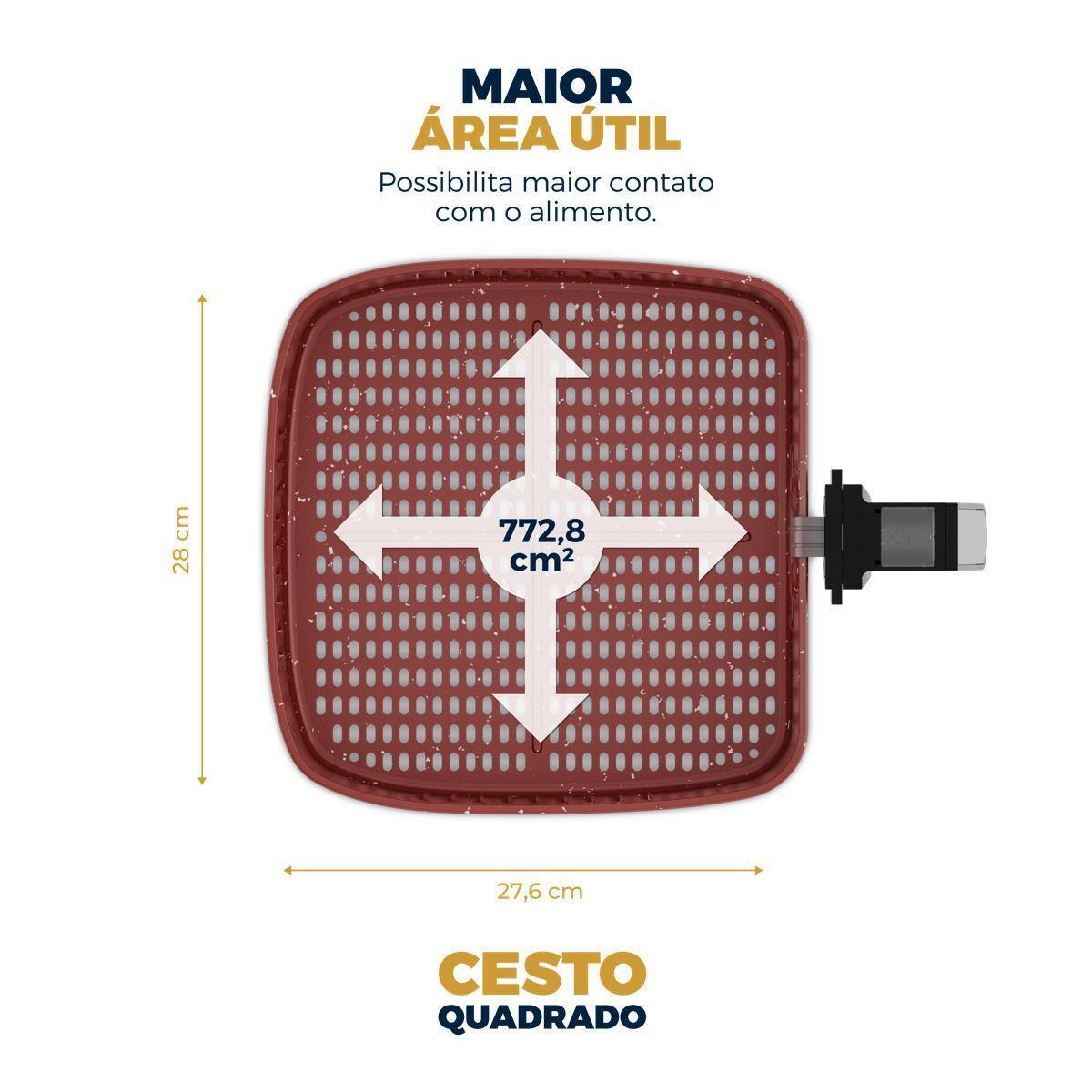 Equipada com a Tecnologia Air Flow 360°, garante cozimento perfeito e uniforme em todos os lados, preparando receitas saborosas em menos tempo. Com capacidade de 9 litros, foi projetado para famílias grandes, podendo preparar desde petiscos até bolos, tortas e frangos inteiros.O revestimento interno Redstone é ultra antiaderente, evitando que os alimentos grudem e facilitando a limpeza. Além disso, oferece mais resistência à abrasão e durabilidade superior.