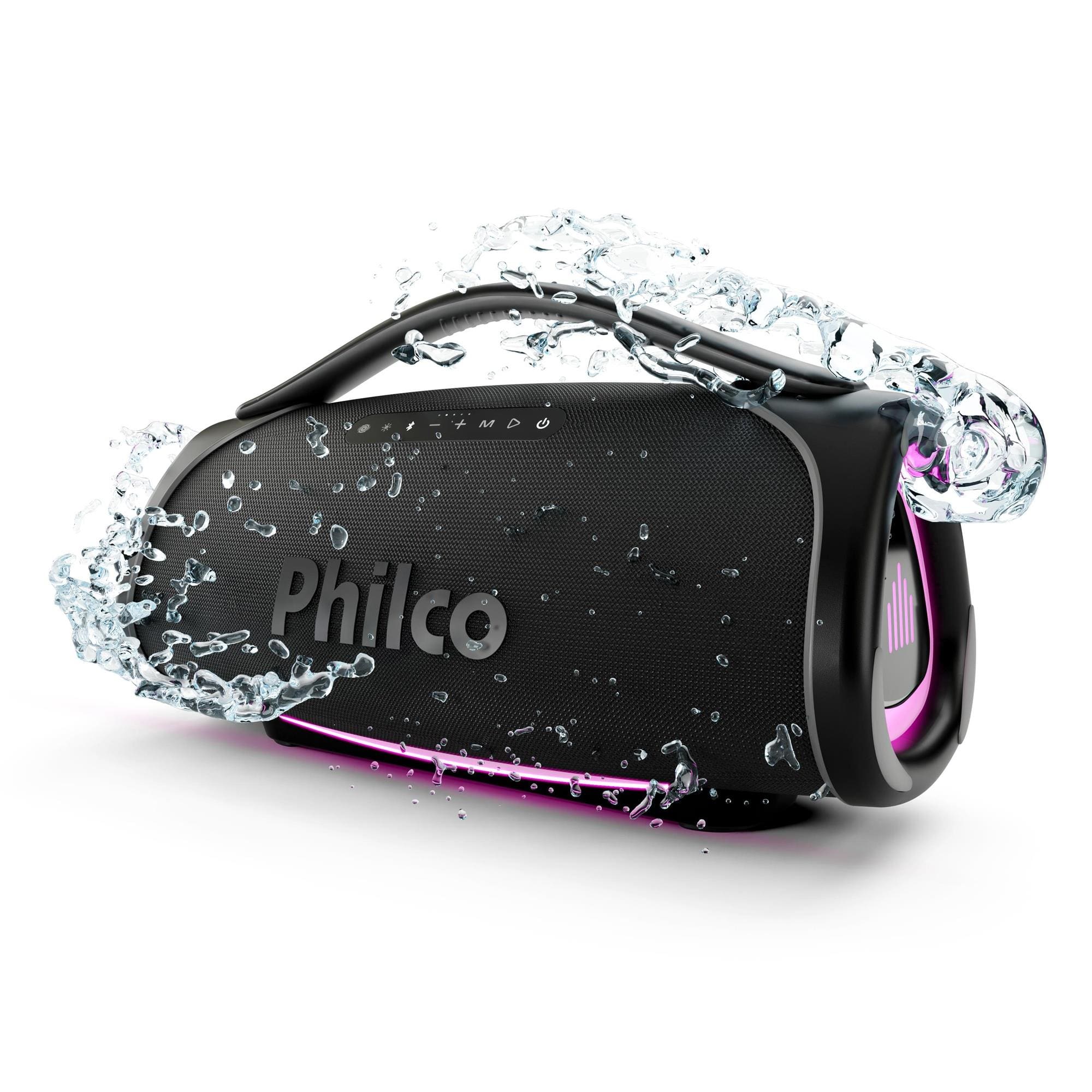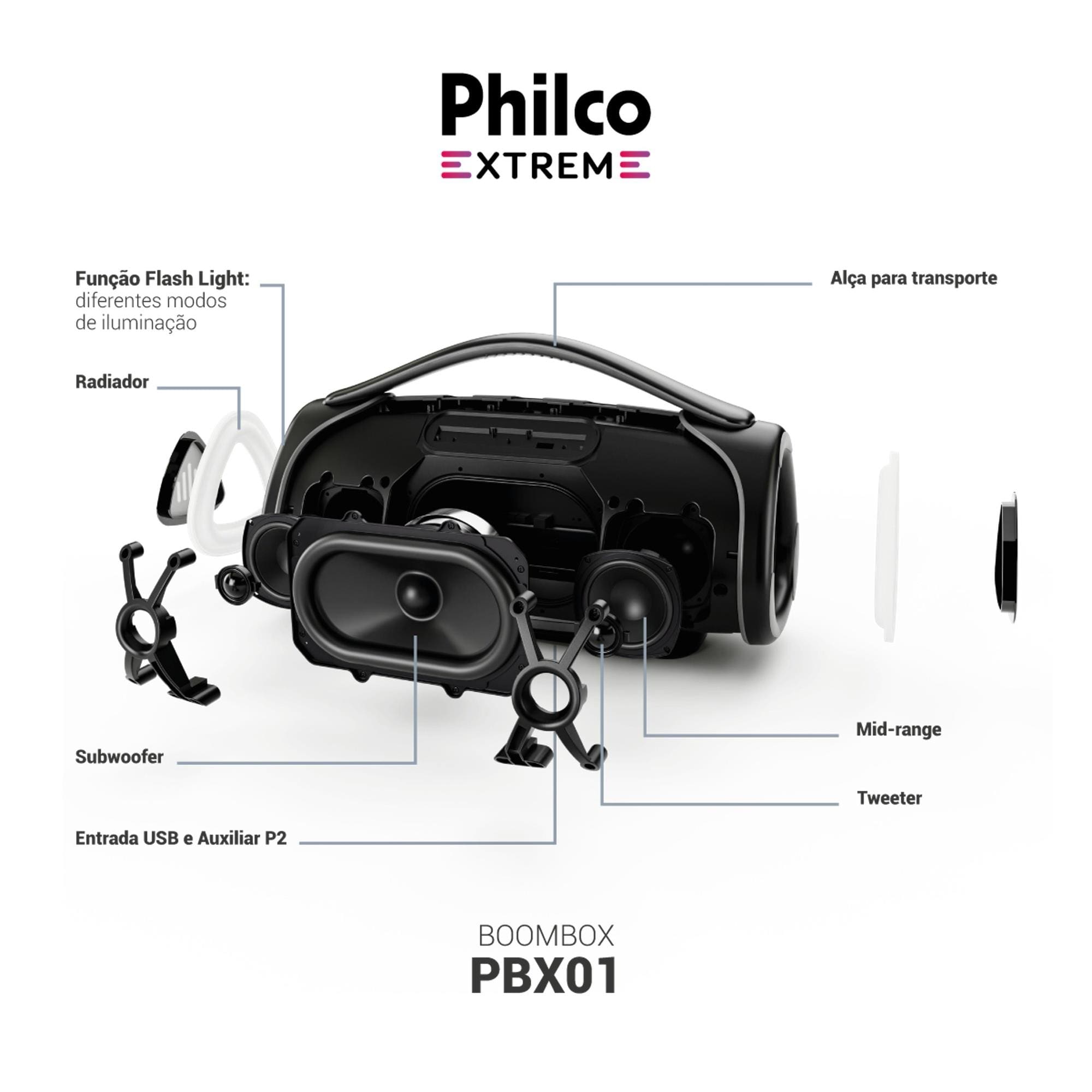 Caixa de Som Portátil Philco Boombox PBX01 – Leve a festa com você! Potência A Caixa de Som Portátil Philco Boombox PBX01 entrega potência de 300W, bateria de até 30 horas e design robusto com proteção IP66, garantindo resistência total à poeira e jatos de água fortes. Ideal para festas, passeios e uso ao ar livre, oferece desempenho confiável em qualquer ambiente. Bluetooth Com Bluetooth v5.4, você tem conexão mais estável, rápida e ainda visualiza o indicador de bateria diretamente no celular. A PBX01 conta com entrada USB e P2, além de suporte aos formatos MP3, WMA e WAV para reprodução via pendrive. O equalizador oferece modos Rock, Pop, Classic, Jazz e Flat para personalizar o som ao seu gosto. Philco Connection TWS Para uma experiência ainda mais envolvente, o sistema Philco Connection (TWS) permite sincronizar duas PBX01. A tecnologia Exbass reforça os graves e a Flash Light com IA oferece 5 modos de iluminação totalmente personalizáveis. Compatível com o App Philco Audio, você controla e ajusta tudo diretamente do smartphone.