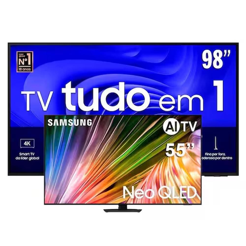 Smart TV 98" Samsung Crystal Ultra HD 4K UN98DU9000 com Gaming Hub + Smart TV 55” 4K Samsung Neo QLED 55QN85D com Processador com AI e Energy Mode